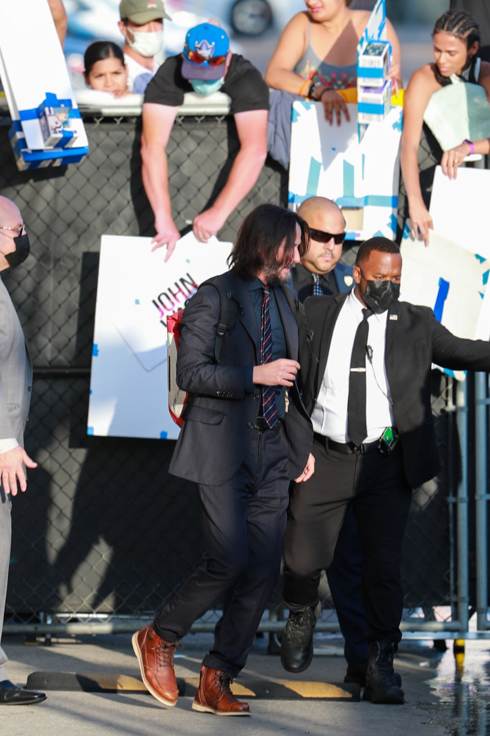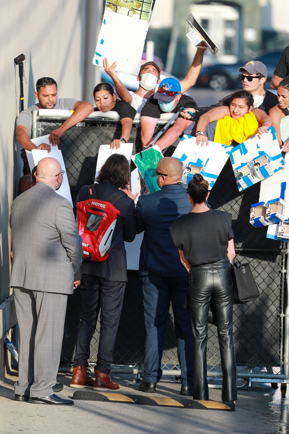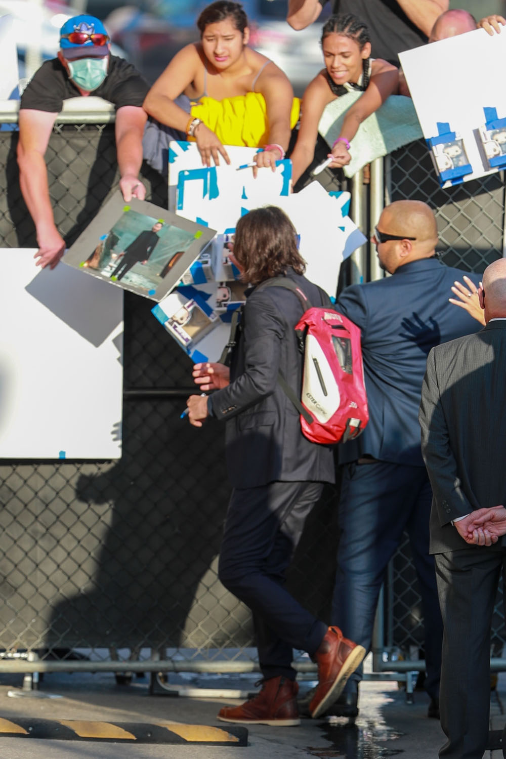 So back to him on Kimmel and how the crowds outside reacted to him – the paps described it as a “frenzy”. And there’s Keanu, signing autographs with his backpack which I find so endearing because that really is his own sh-t, he doesn’t need an assistant to carry his belongings. And it doesn’t go with his suit but it does go with his suit because he’s Keanu and what the f-ck does he care about things going together?!
