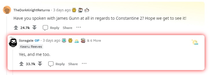 I can kinda-sorta see it, a sort of coiled tension Keanu could bring to Wolverine, but he is best, as an actor, in roles in which he can imprint as a kind of blank slate for the audience, like Neo, like Jack Traven, like Johnny Utah, and to a lesser extent, John Wick (who provides a particular kind of macho wish fulfillment, but who also has more personality than a run of the mill Keanu character). So while I understand the desire to play Wolverine, that’s one case of Hollywood Sliding Doors that went the right way (at least the first time, we have yet to see who eventually replaces Hugh Jackman). Elsewhere in superhero stuff, Keanu confirmed he has spoken to James Gunn about Constantine 2, which isn’t a promise of anything, but is at least a positive indication that movie might happen someday.