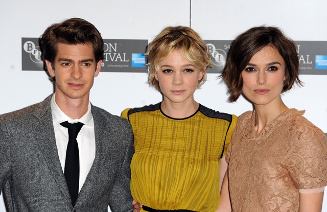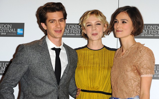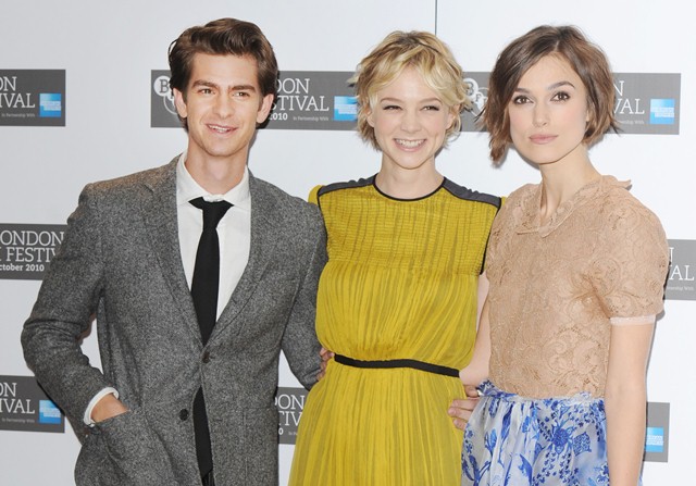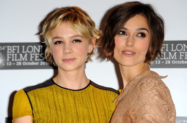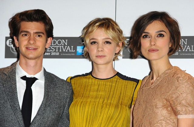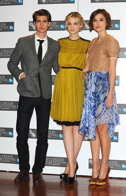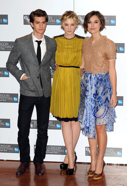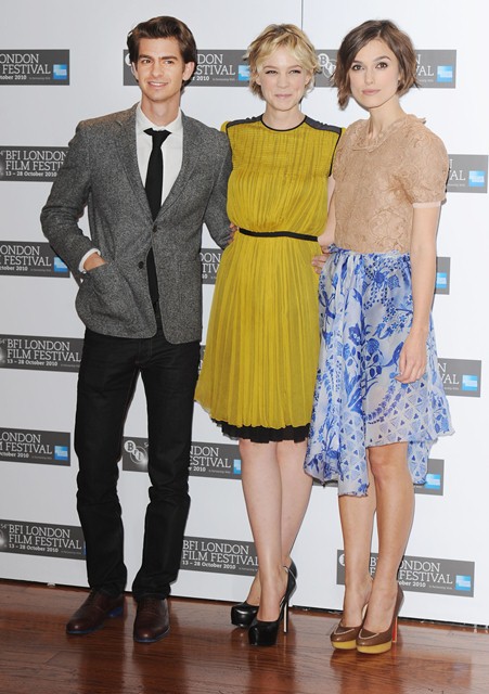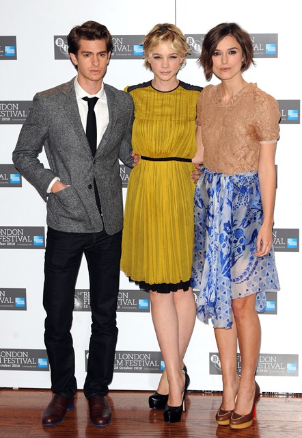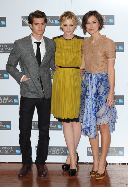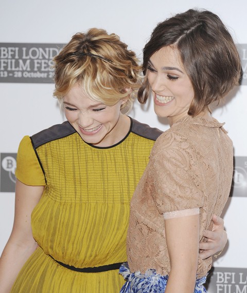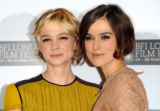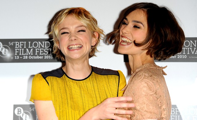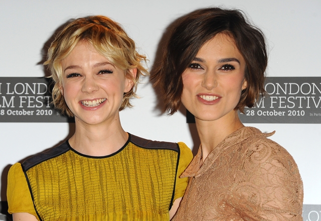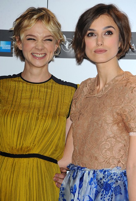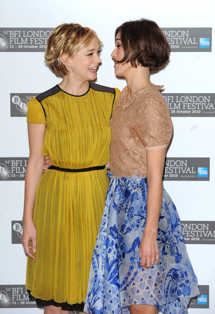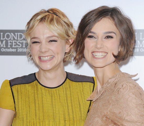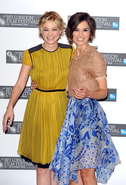 Keira Knightley and Carey Mulligan were lovely together today at the London Film Festival photo call for Never Let Me Go. SO cute. The hair is the same-ish now, and they were born 2 months apart, just 25, and both nominated for Oscars, and both among the elites on a short list of top actresses, and neither one of them have these issues.