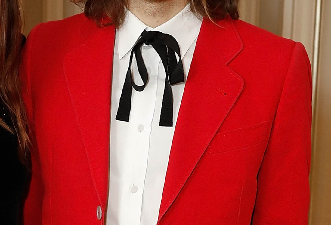 I would wear James’s red suit. I would definitely wear it the way he’s wearing it with a ribbon at the neck. He’s wearing it so beautifully I’m barely paying attention to her outfit. It’s a lovely black dress, bell sleeves, I’d wear that too. But the focus of their couple style is his steeze. And I am here for it. I’m here for a man standing next to his wife wearing an outfit that he could have borrowed from her closet.