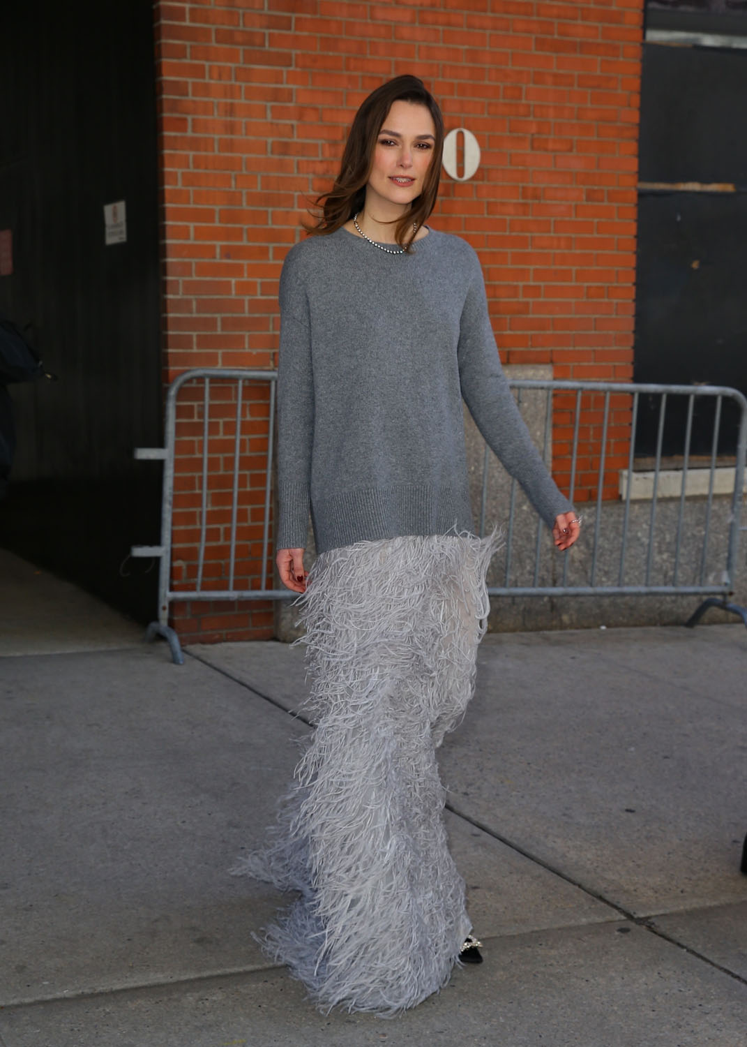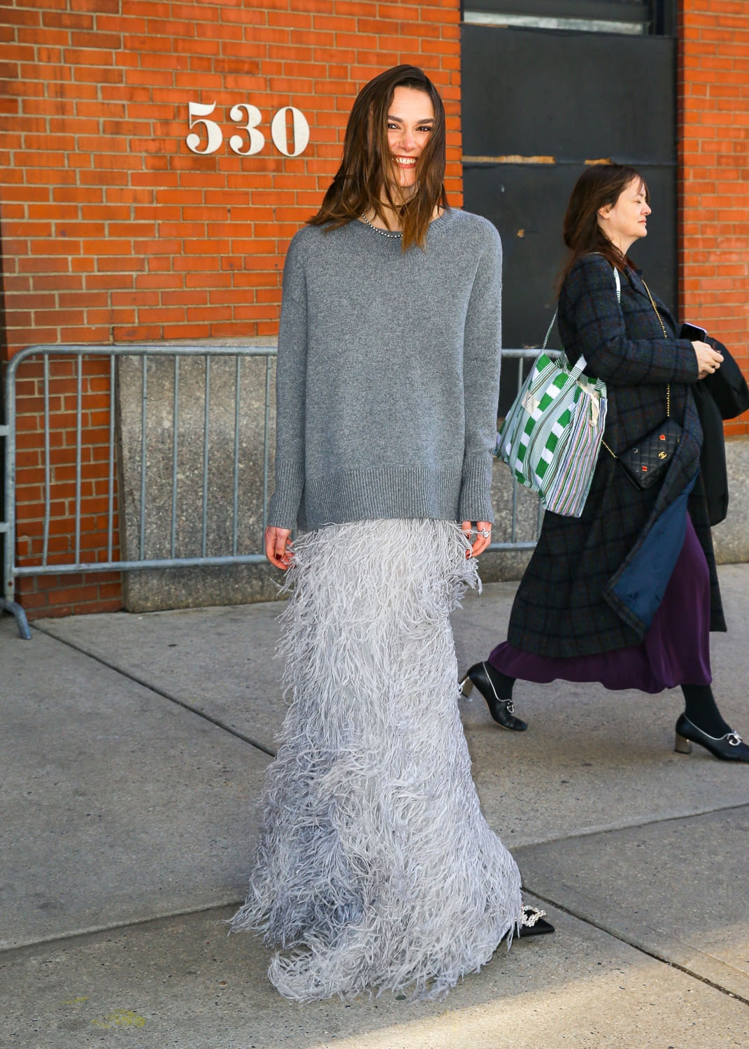 And we’re still not done because now we have what might be my favourite of them all – it’s just SO good. A slouchy, slightly long grey sweater over a Valentino feather skirt, or it could be a dress; it’s effortless and elegant, which is basically the definition of chic.
