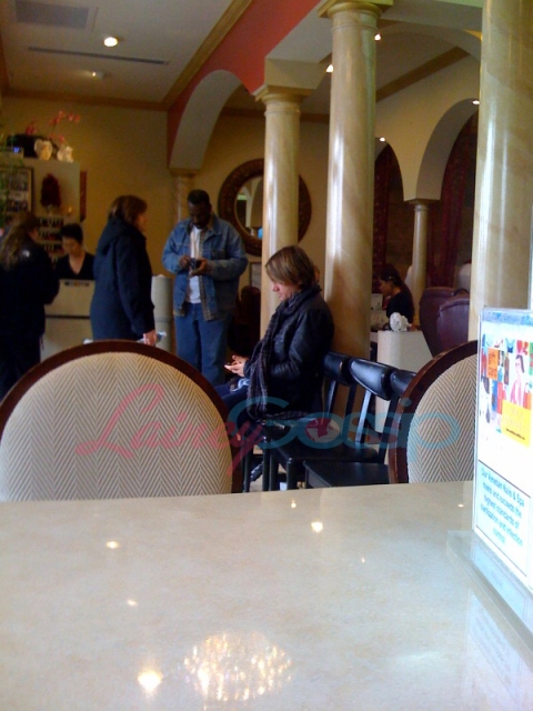So her husband decides to stop in and surprise her. Only she’s fallen asleep. Keith waits patiently, tapping on his blackberry. When she wakes up, he goes to sit next to her until her manicure is complete.