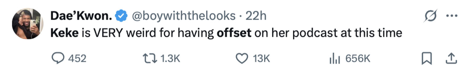 Whatever the case, I think people are interpreting Keke having Offset on her platform as an indication that she may be taking his side or pledging some sort of allegiance to him, but depiction is not endorsement, nor is hosting someone on your podcast. And a lot of people are using this as an opportunity to levy long-standing allegations that she’s male-centred, but I think that adds to the irony of Offset getting off almost completely scratch-free in all of this while Keke catches the heat. Because Keke having him on her platform shouldn’t result in a collective scolding by the internet so powerful it overshadows what Offset put Cardi B through, or run the risk of pitting two women against each other. That’s how this vicious cycle continues.