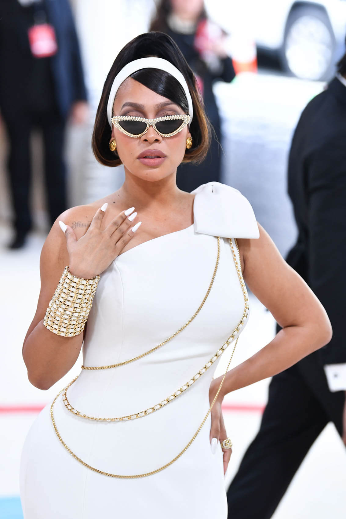 Sergio also dressed La La Anthony, who nailed the theme. It was more of a 60s aesthetic with that classic Chanel sportswear sensibility. The hairstyling was right and the way La La was posing on the carpet looking out above her glasses? Perfect.