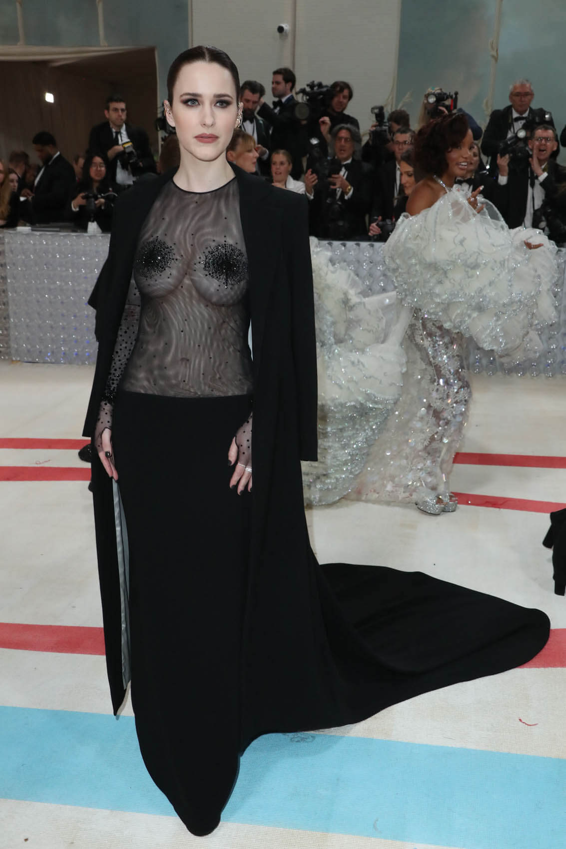 Here’s Keke, who’s a literal mummy, just two months postpartum and open about how pregnancy has changed her curves forever, and she’s embodying “Kaiser” Karl’s contributions to fashion world beautifully. She’s the Chanel-tweed-woman, for the modern day and serving legs and hips and body. I also love her two-toned cape with a train. There were a lot of trains on that carpet, but this is the most elegant.