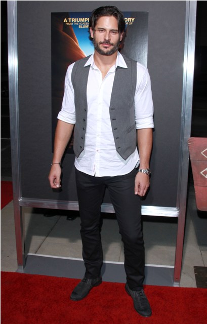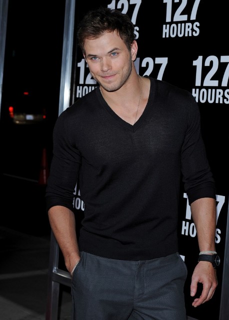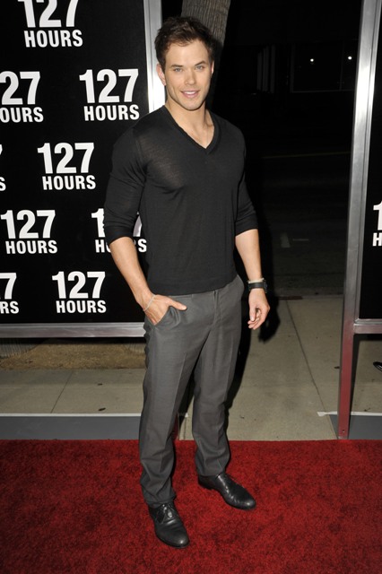Look at Kellan Lutz trying to hide is sulky pout. He thought he'd be the only piece of man meat with stripper nipple action at the 127 Hours premiere last night and must have been sorely disappointed to drive up against True Blood's Joe Manganiello. I imagine Kellan wanted very badly to challenge Joe to a throwdown at the afterparty. Werewolf Vampire Dance-off! They should be selling tickets to that sh-t. And all the people from Luke Perry's Dragon-Con appearance would have somewhere else to go.