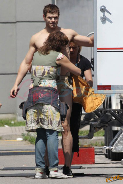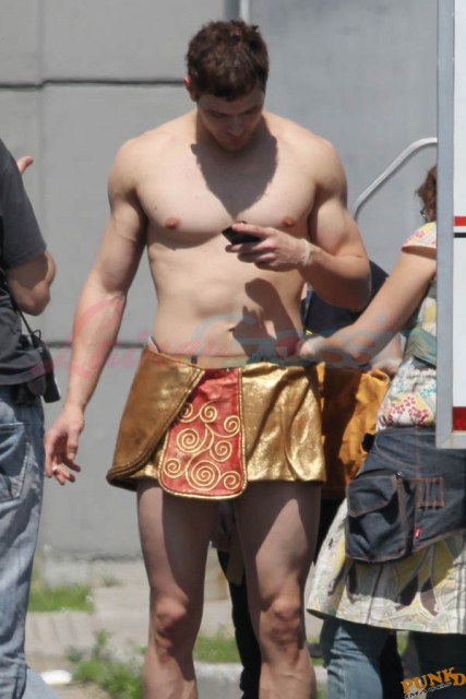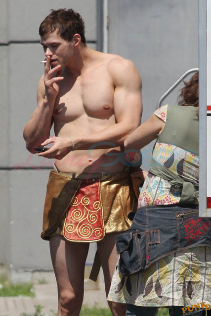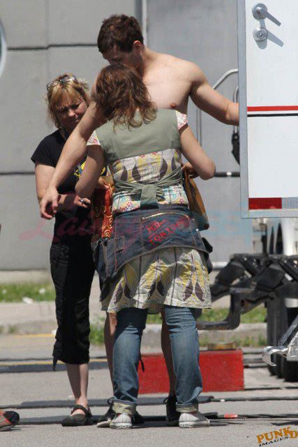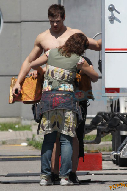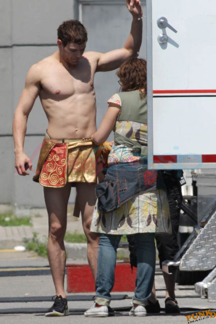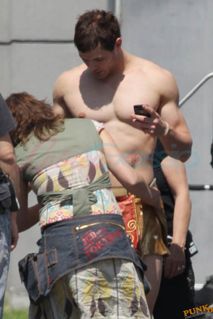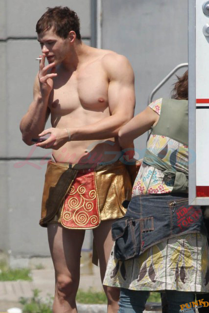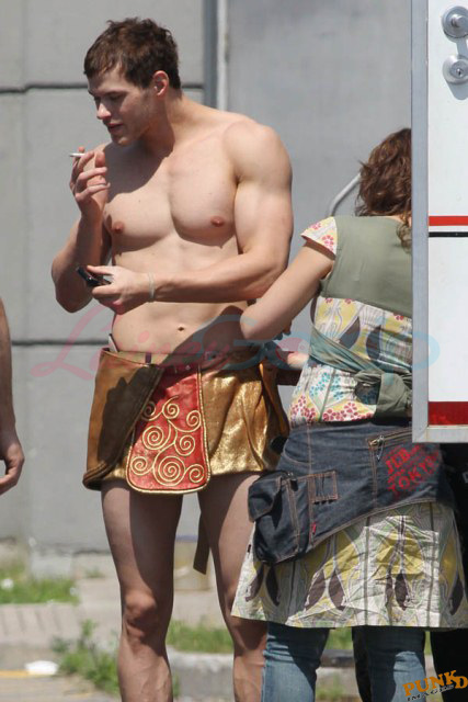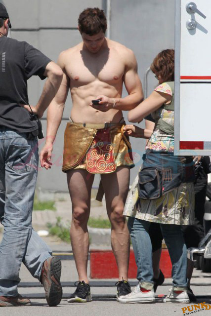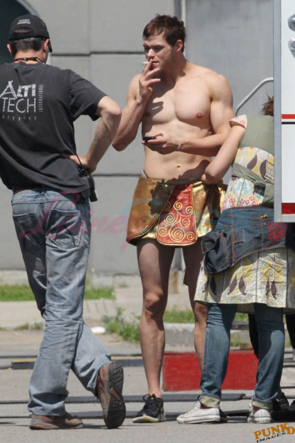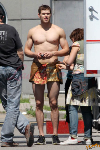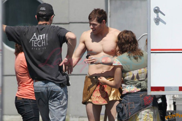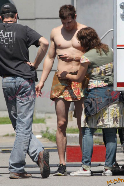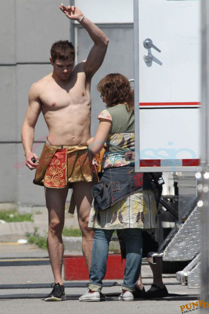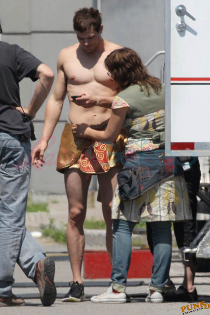 This is Lutz getting costumed yesterday during a cigarette break on the Montreal set in a delightful loincloth that shows off his brawn. He is leaner than I thought. Looks good. No lines necessary then? I think I've seen him utter maybe 3 in both Twilight movies released thus far.