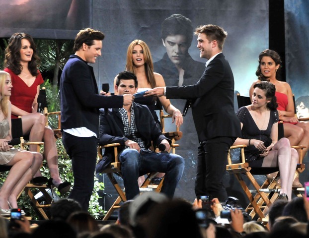 Also included are photos from last night’s Twilight special on Jimmy Kimmel in advance of the release of Eclipse. Everyone was there, except for Kellan of course, because he has to go to work on the epic and anxiously awaited Immortals. Oh wait…no, that’s Pattinson, currently filming the much-anticipated adaptation of Sara Gruen’s Water for Elephants opposite Oscar winners Reese Witherspoon and Christoph Waltz. I see Pattinson in the cast photo, but no Lutz. See what I mean? RPattz can get a night off from his movie, a legitimately massive production with huge expectations in which he is The Star, but Lutz can’t wait one day to arrive in Montreal for a movie that is at best Clash of the Titans: The high school years? I don’t think so. This is straight up posturing.