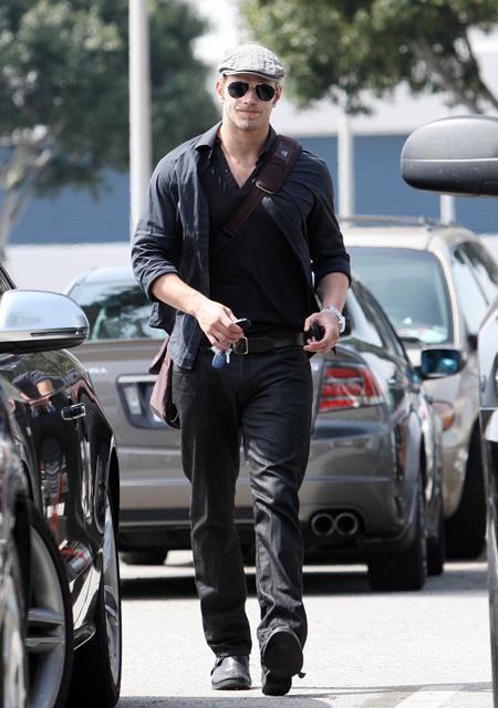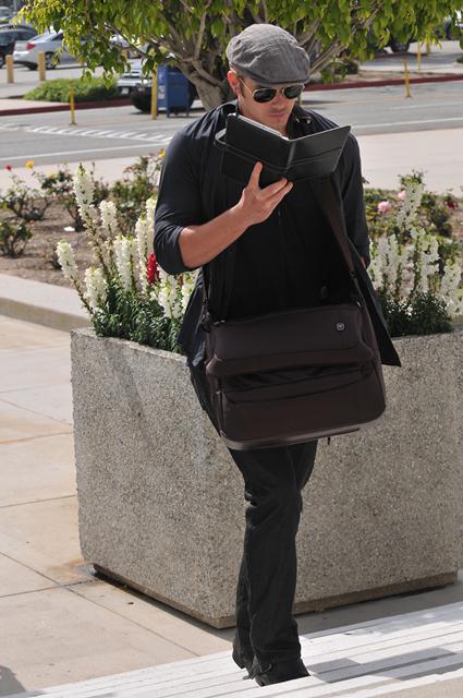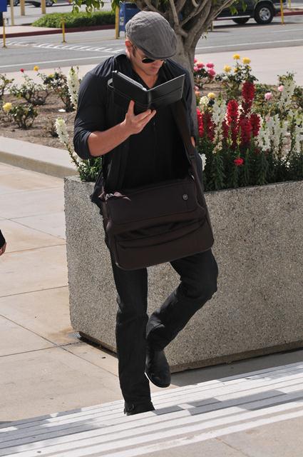 Yesterday Kellan Lutz was spotted out and about heading into a meeting. As you can see, again he’s fronting like he can’t stop reading on his Kindle. Reading and walking. Or, more accurately, reading and posing. Read Posing. Because when you see Kellan Lutz and his nipple tweaking beaters, you automatically think, well f-ck, now there’s a cerebral actor.