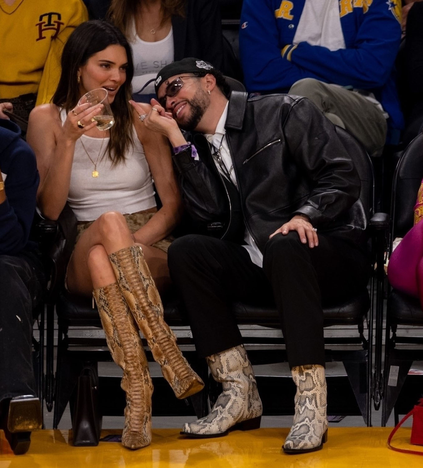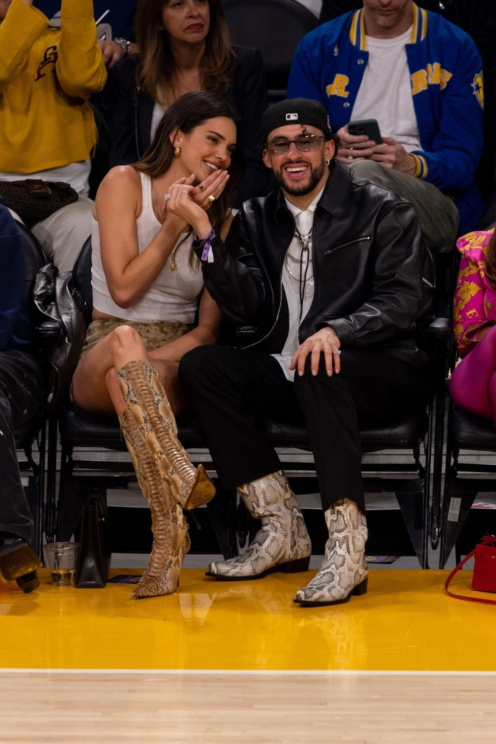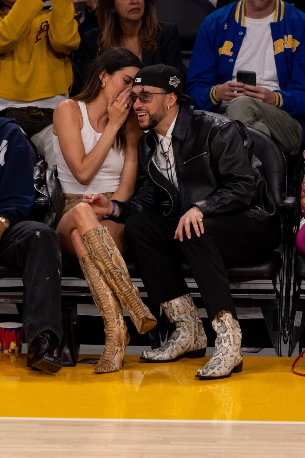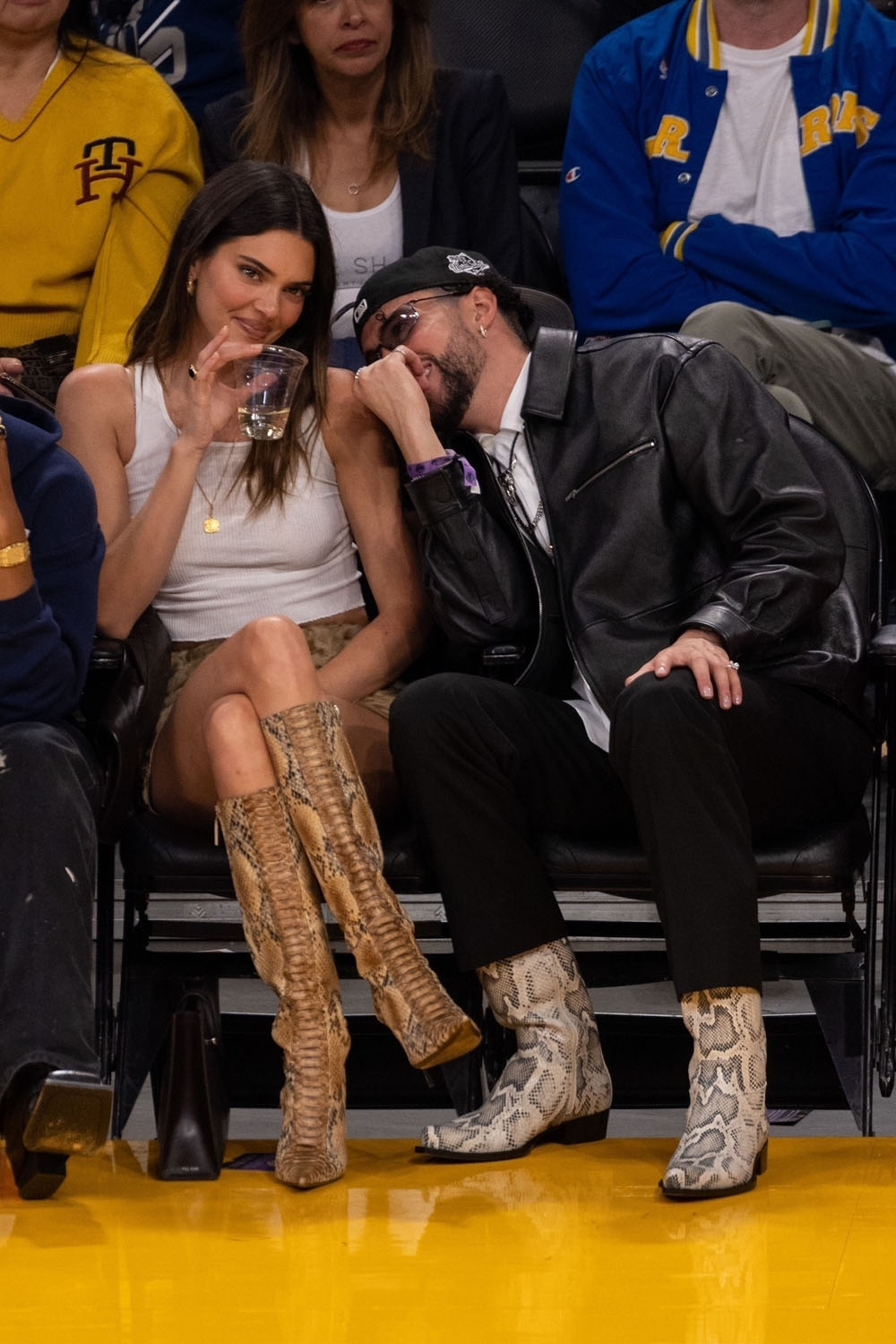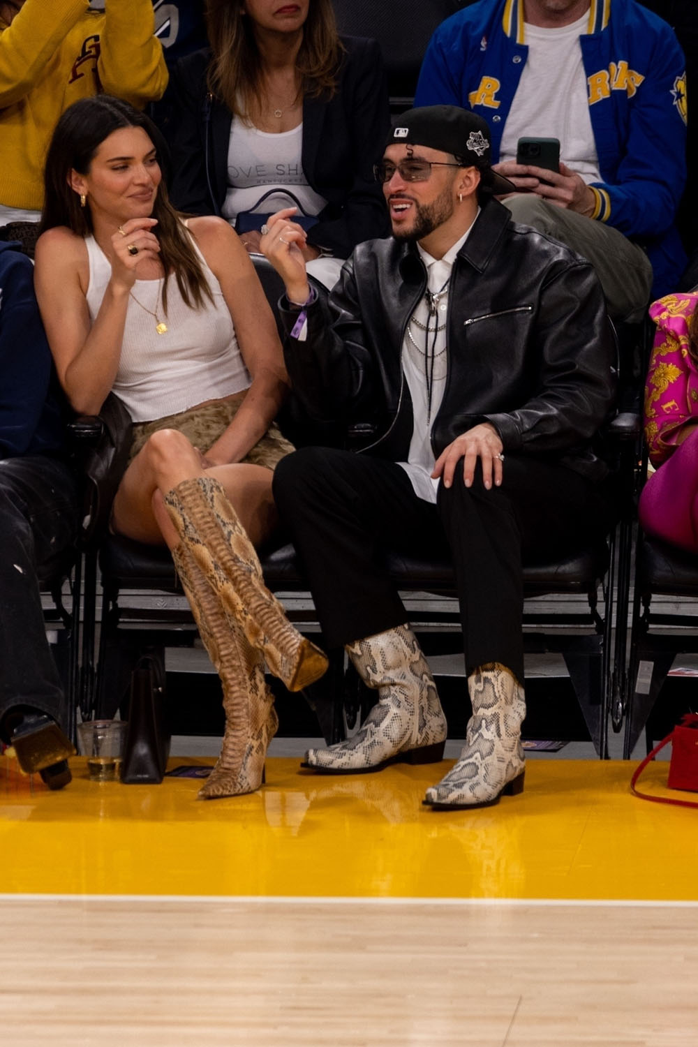Kendall Jenner and Bad Bunny were photographed out a couple of times together this weekend. First they were courtside at the Lakers game on Friday to watch the Lakers take out the Golden State Warriors and advance to the conference finals, both wearing snake print boots.