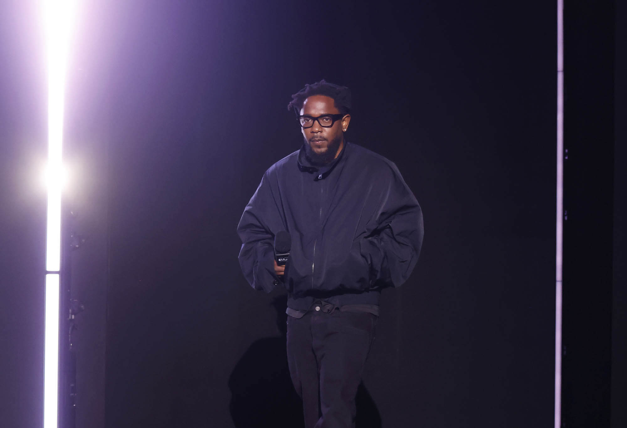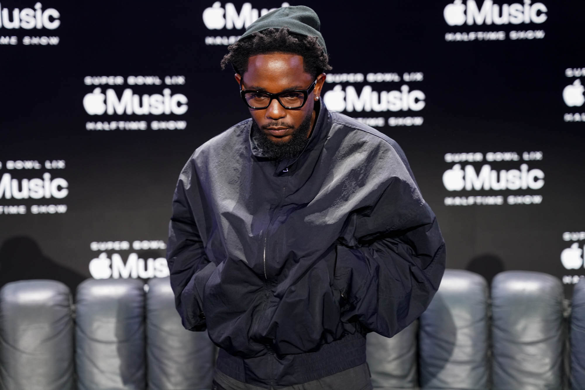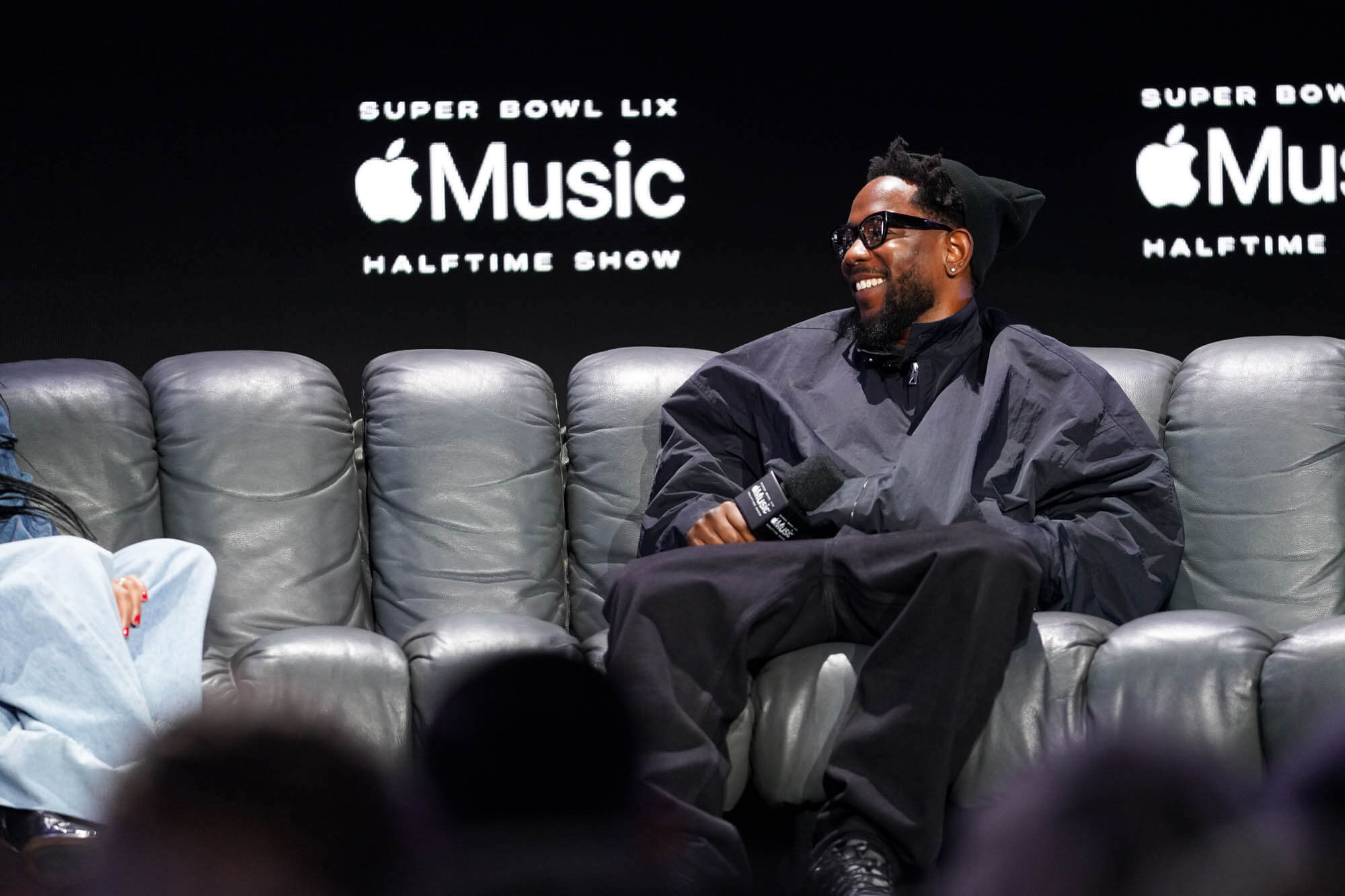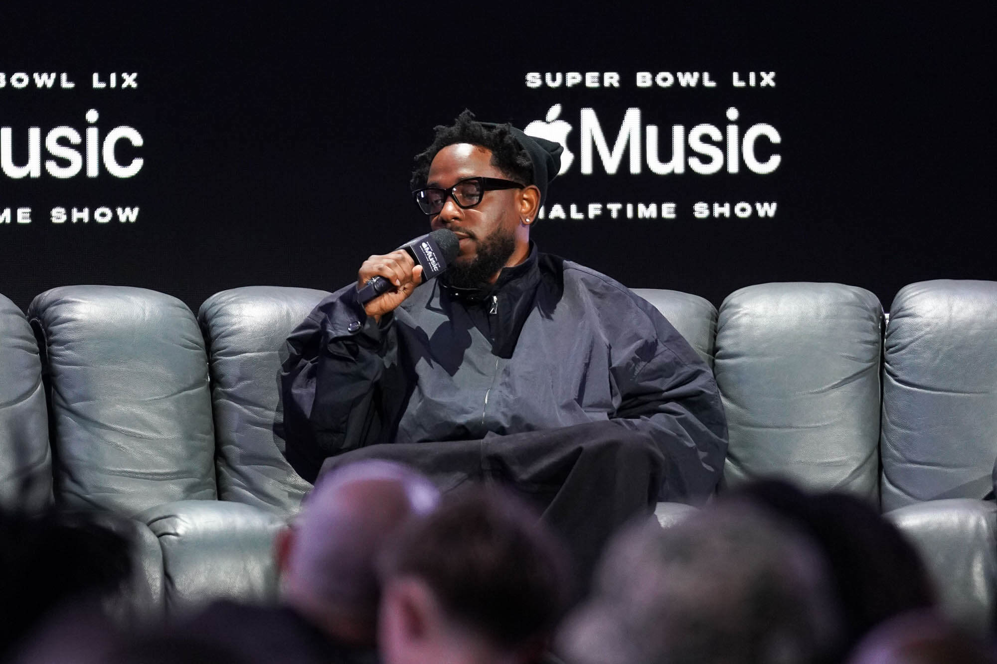 Attached: Kendrick Lamar on stage at the Pregame and Apple Music Halftime Show and Press Conference on February 6, 2025.
