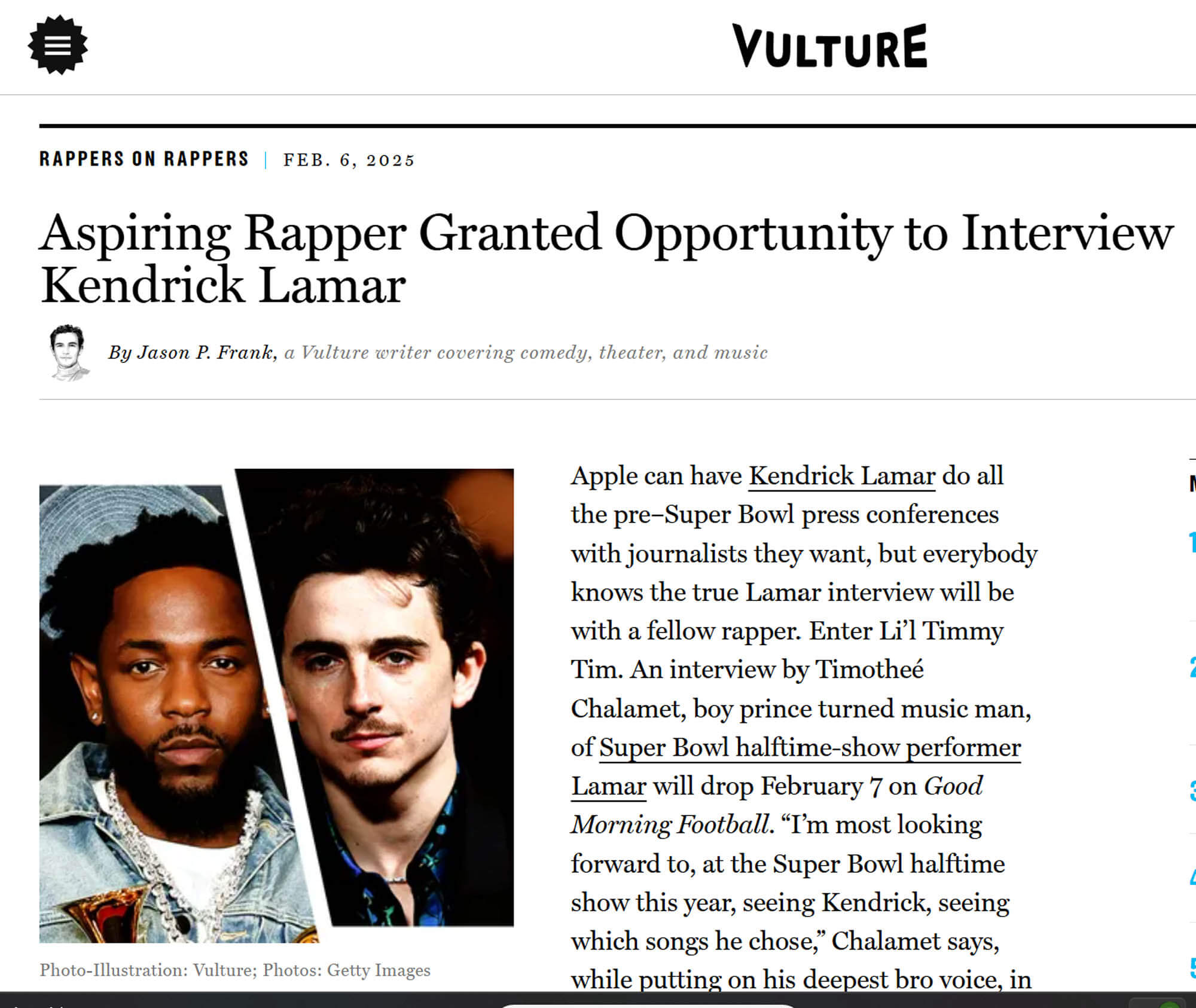 A halftime performer has to get in bed with the NFL and Apple Music and all that sponsorship. Playing halftime is the most corporate of performances. And doing an interview with Timmy Bob Chalamet is a clout exchange, plain and simple. Unless Timothée Chalamet has some Compton credentials that we’ve never known about until now.