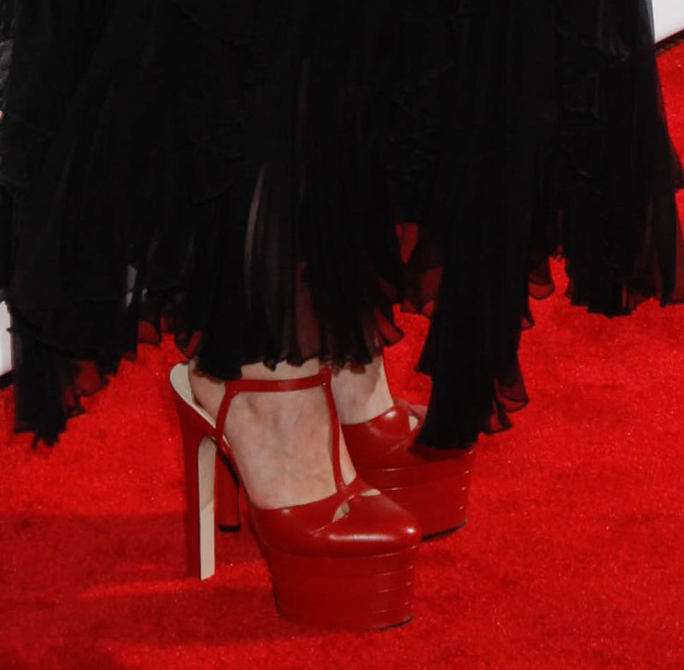 On her they’re maybe not as offensive as they would be on someone else. But still. Still I hate them. At this point, how do you class up an extreme platform? You can’t. It’s varying degrees of tacky, depending on the wearer, but tacky nonetheless.