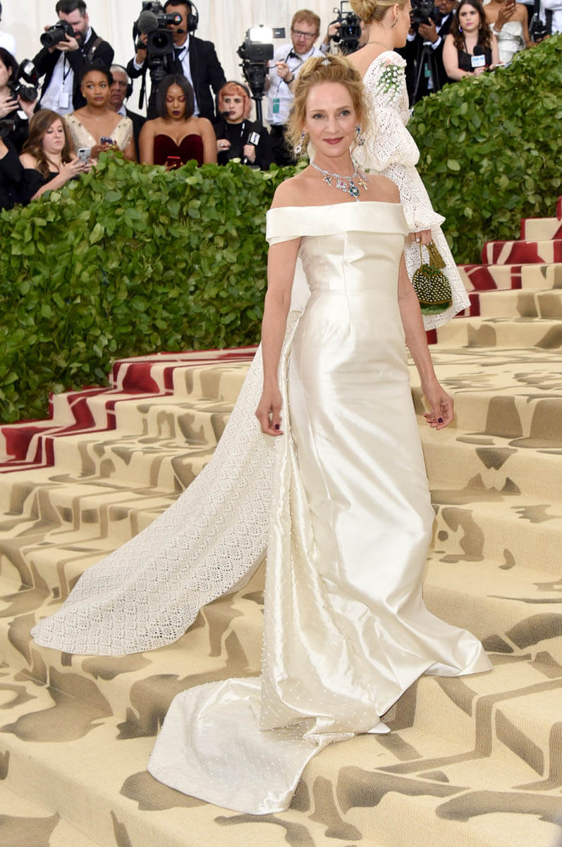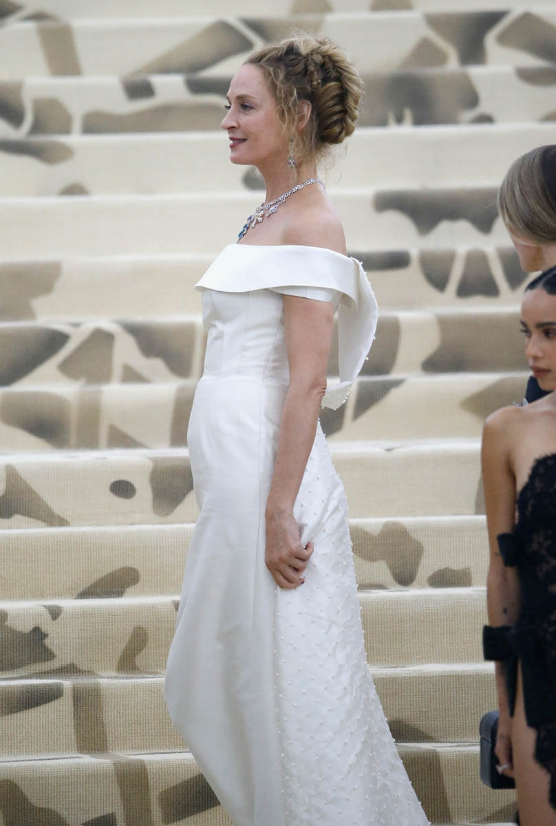 Uma too went pretty simple in this Gabriela Hearst off-the-shoulder white gown. Not really feeling the neck situation – my friend Danielle Graham noted that they look like those charms you put on a bracelets (one for your zodiac, an initial, your favourite Monopoly piece) – but what elevates the whole look here is the hair. For any other occasion? Like the Oscars? Fine. Maybe too much. But this was an elaborate theme, evoking the complicated sh-t they used to do to their hair back in the Marie Antoinette days. I love the accordion effect that the two braids create from the back and the sides. And with her famously unusual features, she really did look like she stepped out of a painting in a museum, which was kind of the goal of the night.