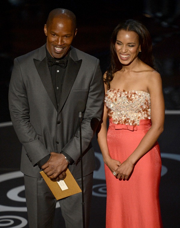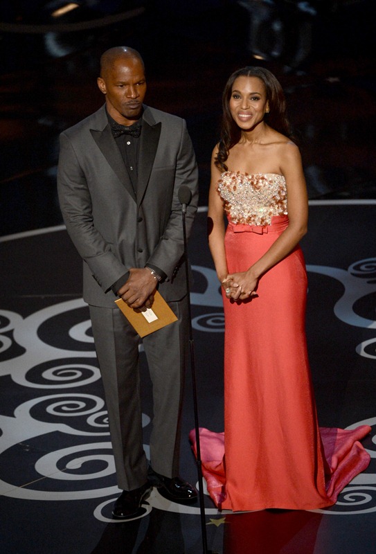 I just finished ranting in another article about how women on the carpet never seem to be able to tell whether the “actual” colour of the dress is going to show up on camera. Washington was a really bad offender here – it was red in some lights, orange in others, pink in still others. And not by a little bit, either. Wild variances. But because the top was somehow kind of candy-stripe coloured, it worked no matter what.