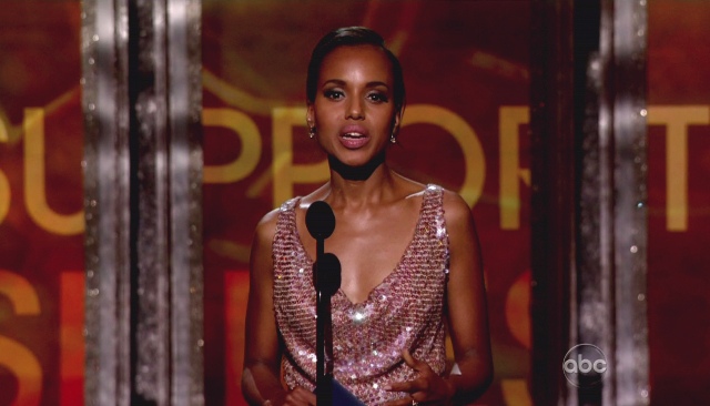 Was deeply into the dress, by the way, first and foremost because it looked like it was easy-peasy to wear but I’ve also been told that everyone else found it pink, while it looked decidedly copper on my TV. Either way, you have to be a beautiful woman to get away with basically draping yourself in pennies, so Washington has that down. But the pronunciation really is a conundrum. Maybe she’s working her way around a new set of Invisaligns – I don’t know. I’m sure Malina will tweet me and let me know.