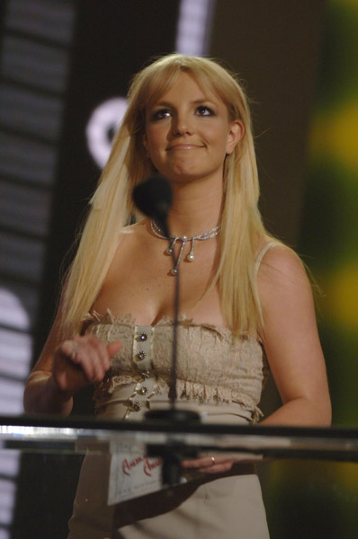 So did you see the opening sequence? Believe me, she KNEW about the opening sequence. Just in case you missed it, here’s a quick recap: Jimmy Kimmel comes out, a few jokes, a few laughs, then he talks about Paris Hilton’s album sucking ass (she was in the audience but they didn’t pan to her – f&ck!) which leads him into a discussion about KFed’s album sucking even more ass and celebrating KFed’s final appearance ever at the AMAs, then he motions over to a KFed doppelganger who is lovered from the rafters into a huge box, sealed by attendants, driven to the ocean, dropped into the ocean, sinking slowly into the ocean, presumably left to drown forever and finally, he introduces the first presenter of the evening, “America’s Sweetheart, the new bachelorette”… Britney Spears. Thunderous applause. Trust me. She KNEW. And she looked fantastic. Still smackin’ that gum – some things never change – but also delightfully pulled together, in spite of the ghetto weave…though I do wonder what that ring is all about. The understated, simple band on her left hand…any ideas?