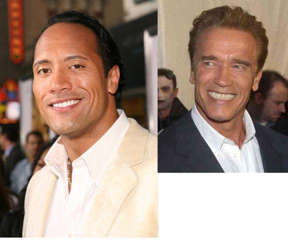Here at the premiere of his new movie Gridiron. Is it just me or is he starting to resemble the Governator? Not that I don’t think the Rock is a sexy bitch, because I do. And yet there’s a very distinct half manorexic, half steroid monkey vibe goin’ on here that I just can’t shake. Your thoughts? Photos from Gossip Rocks