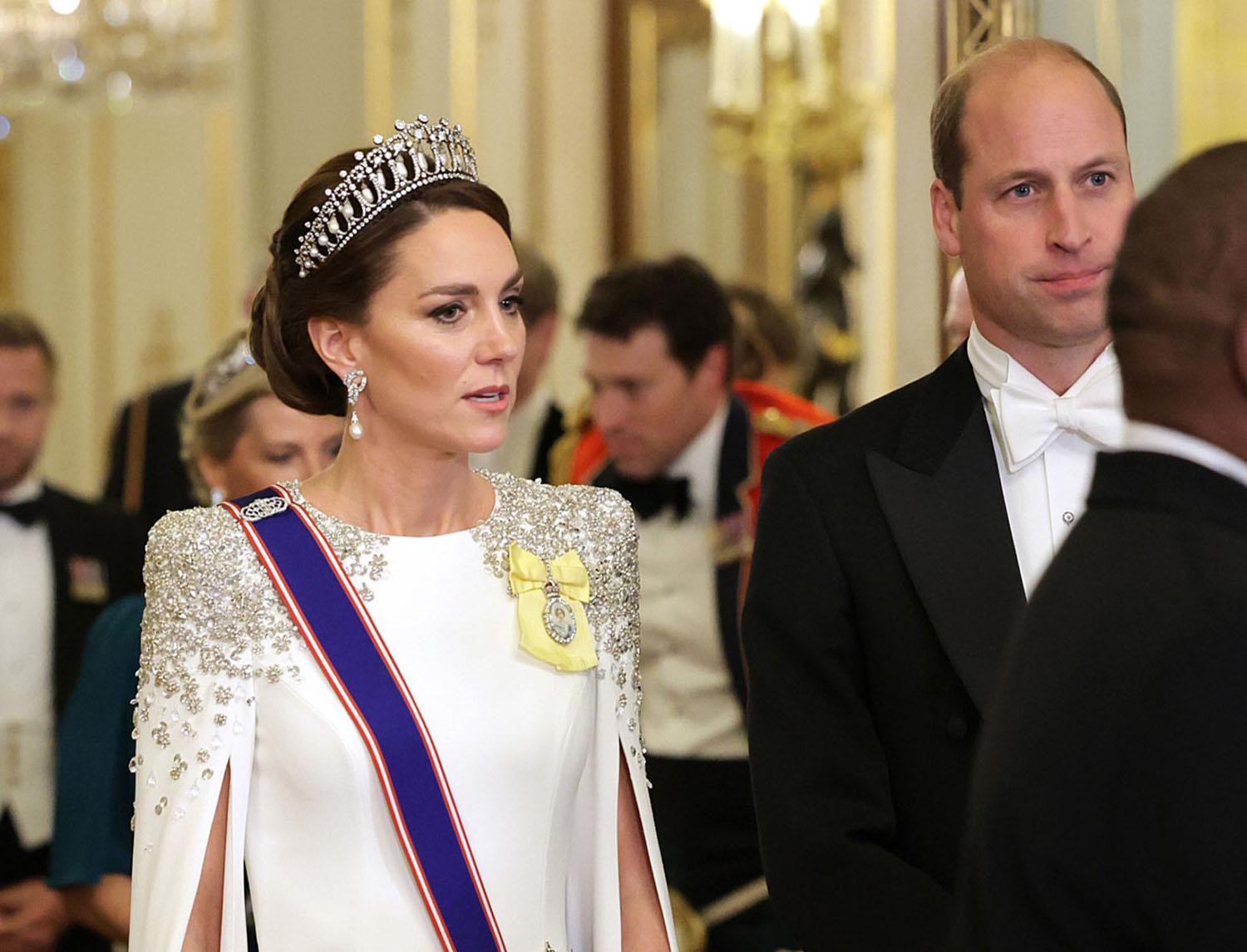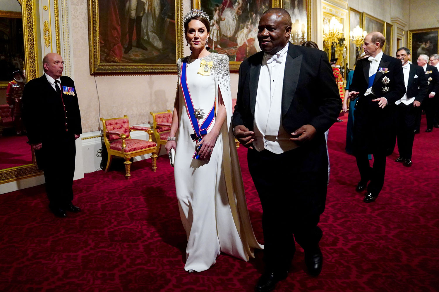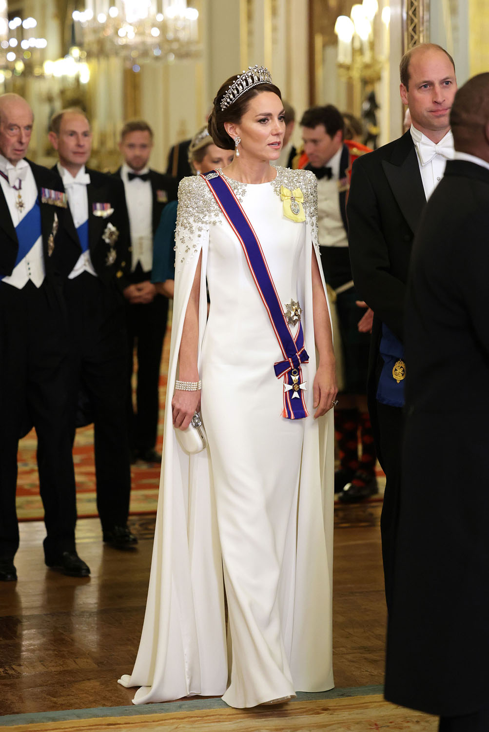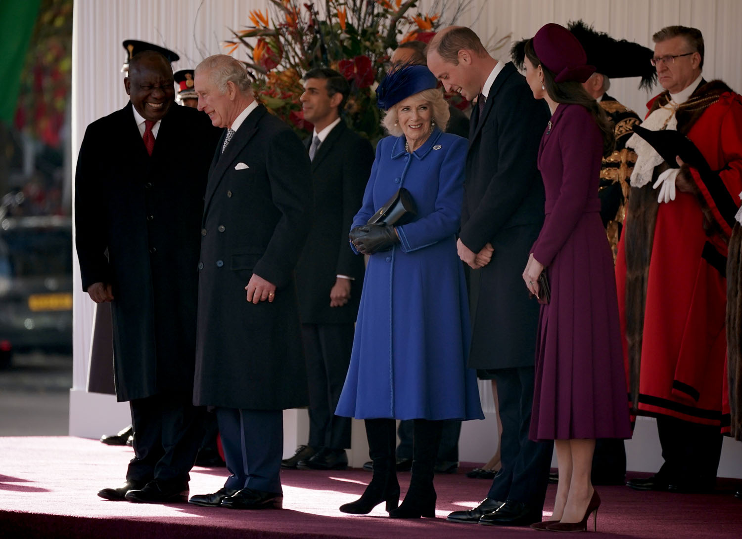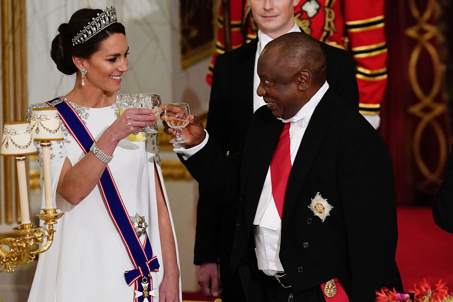 Blue was her colour theme for the day as she was also in blue when she and the King welcomed President Ramaphosa earlier at Horse Guard’s Parade. Princess Kate, meanwhile, opted for the Lover’s Knot Tiara and a white caped Jenny Packham dress with embellished shoulders.