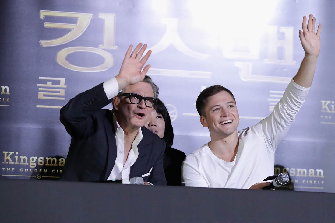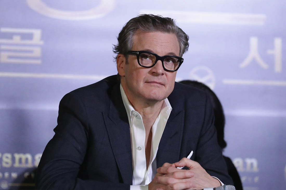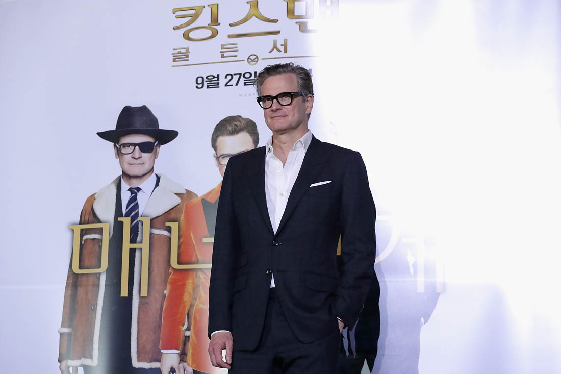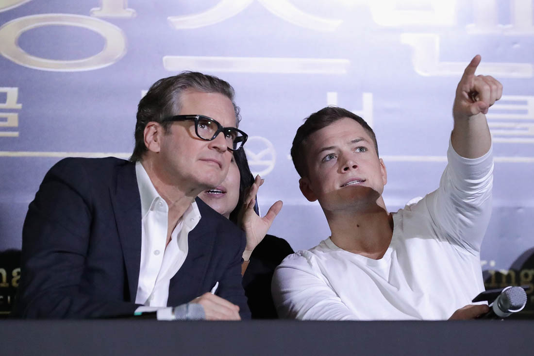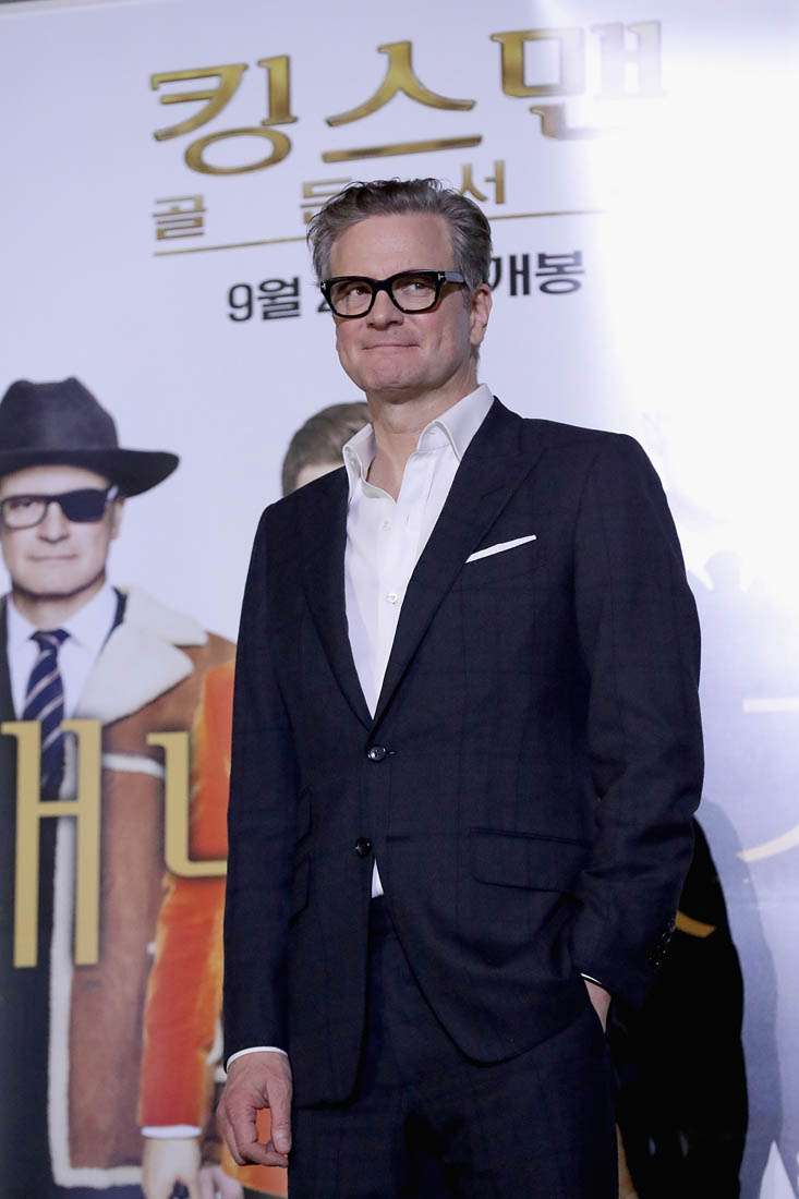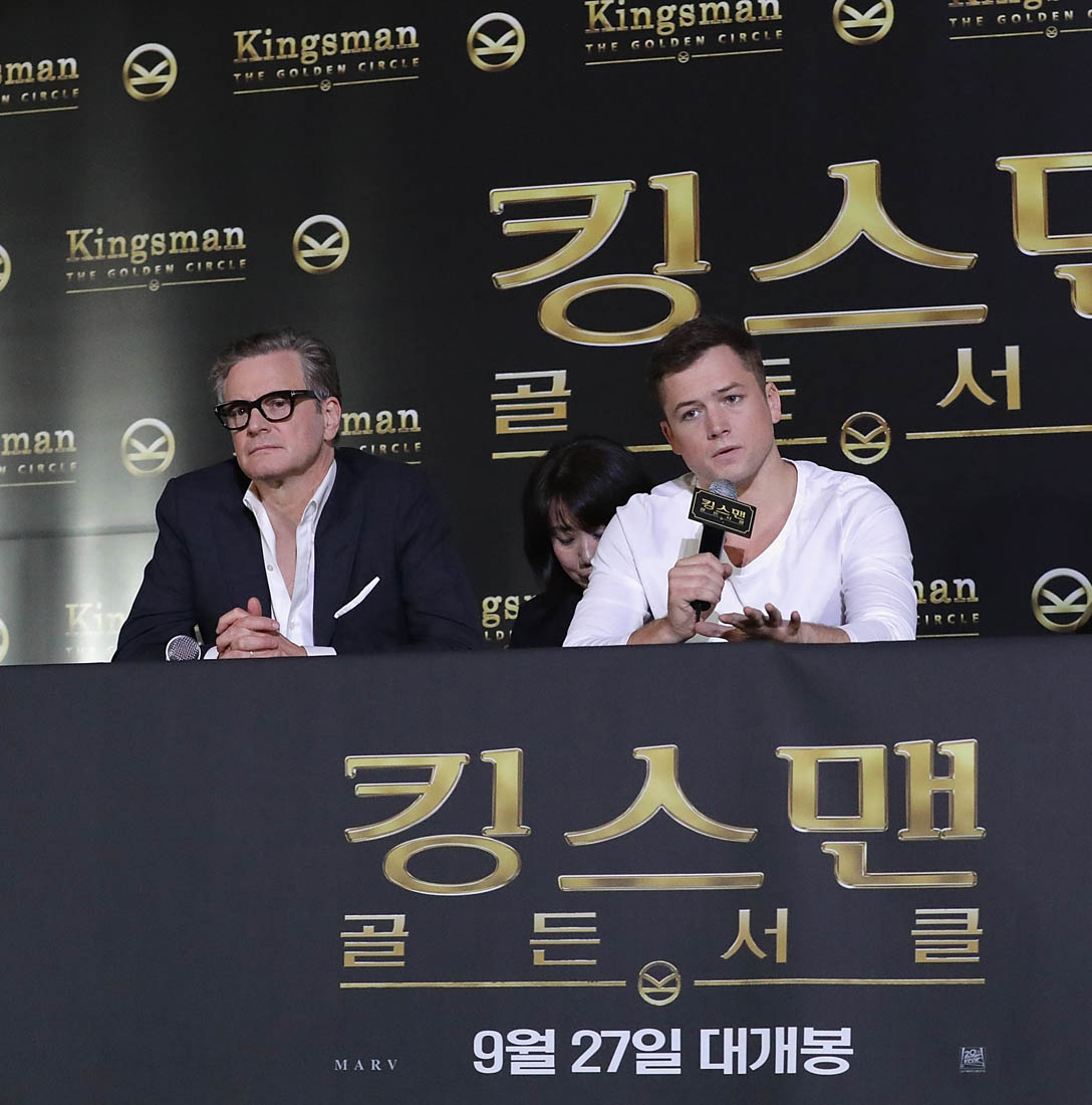 Attached - Colin Firth and Lainey's boyfriend Taron Egerton at a press conference for Kingsman in Seoul yesterday,