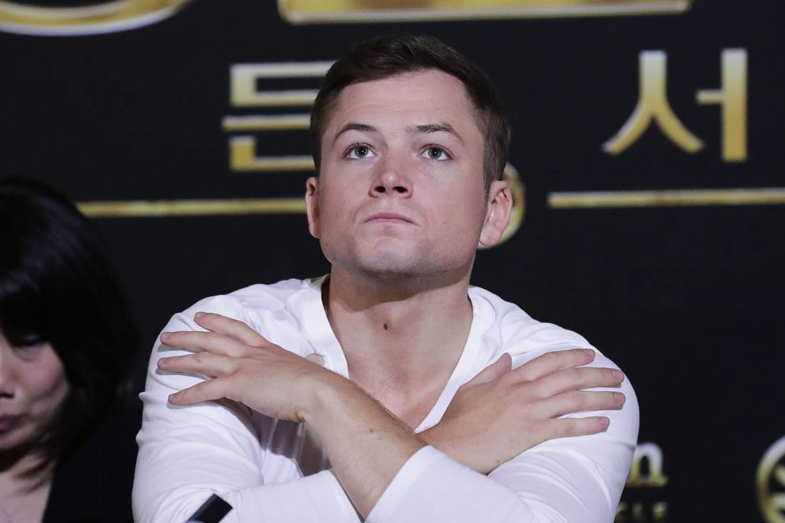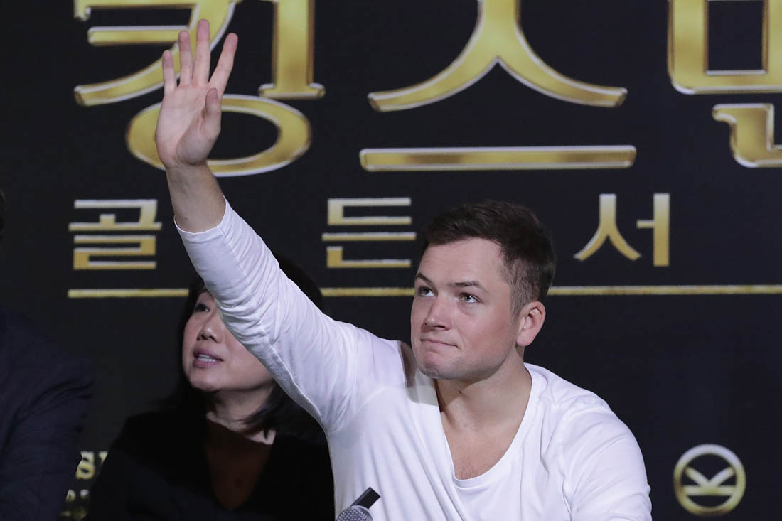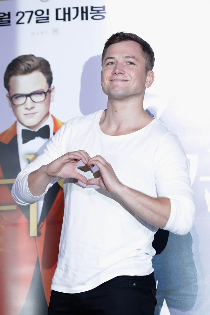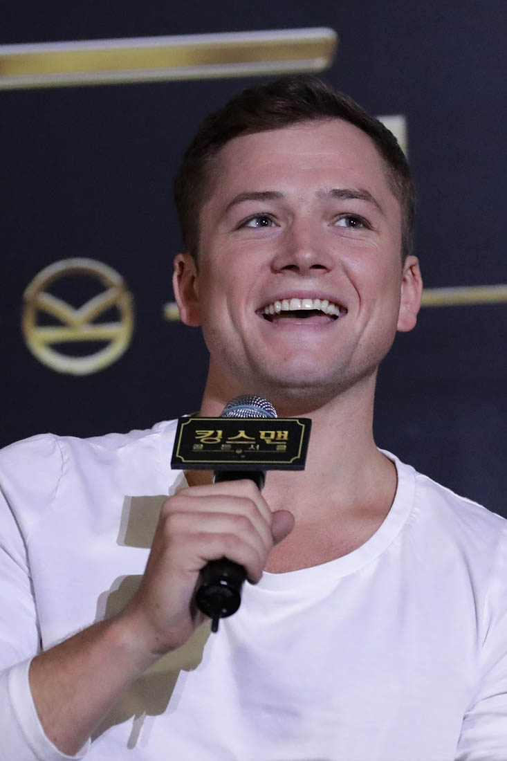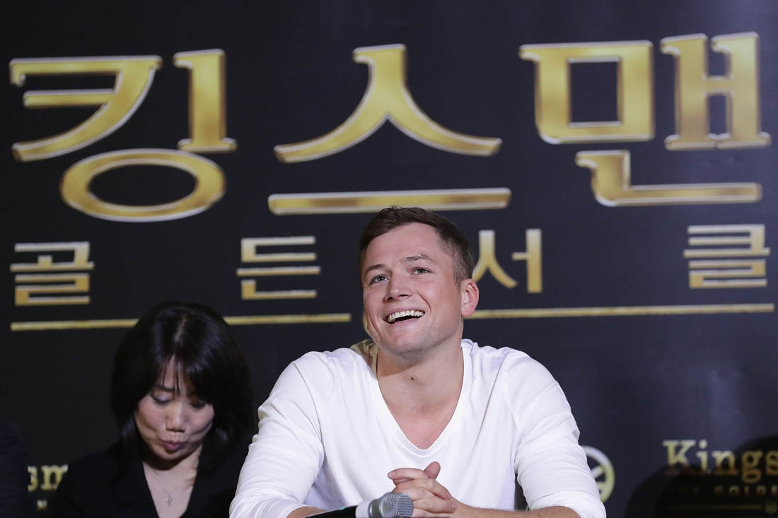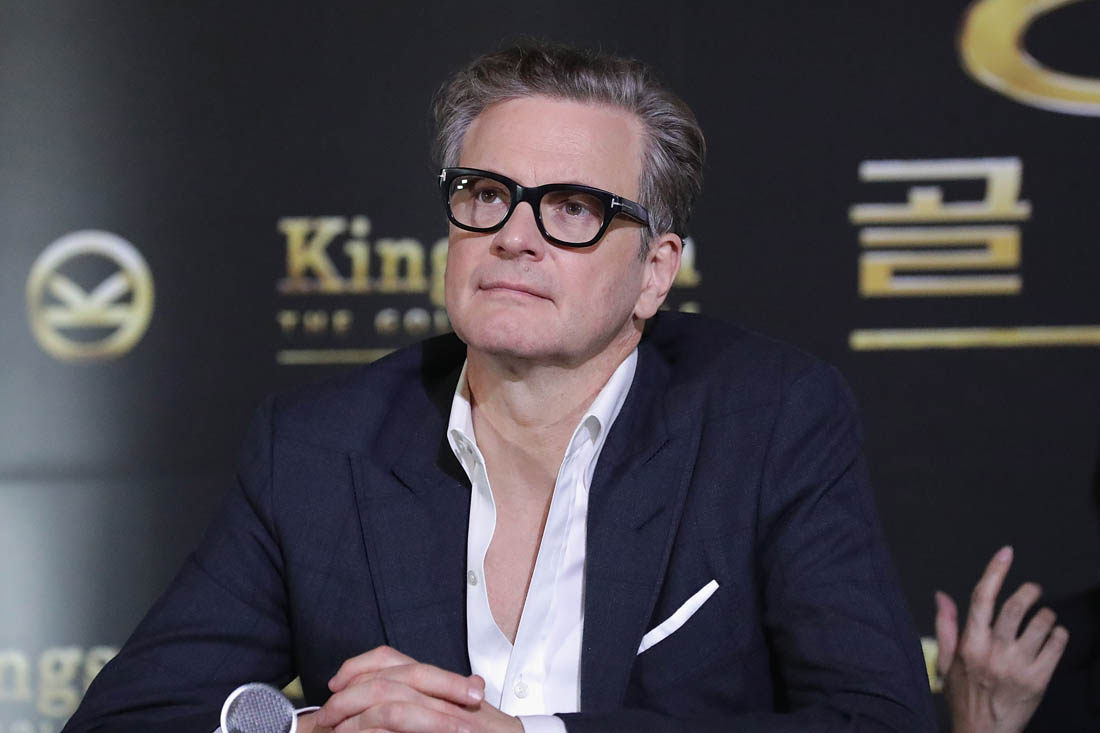 Attached - Colin Firth and Lainey's boyfriend Taron Egerton at a press conference for Kingsman in Seoul yesterday,