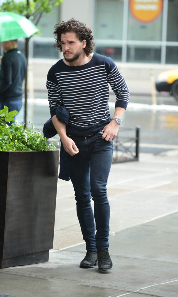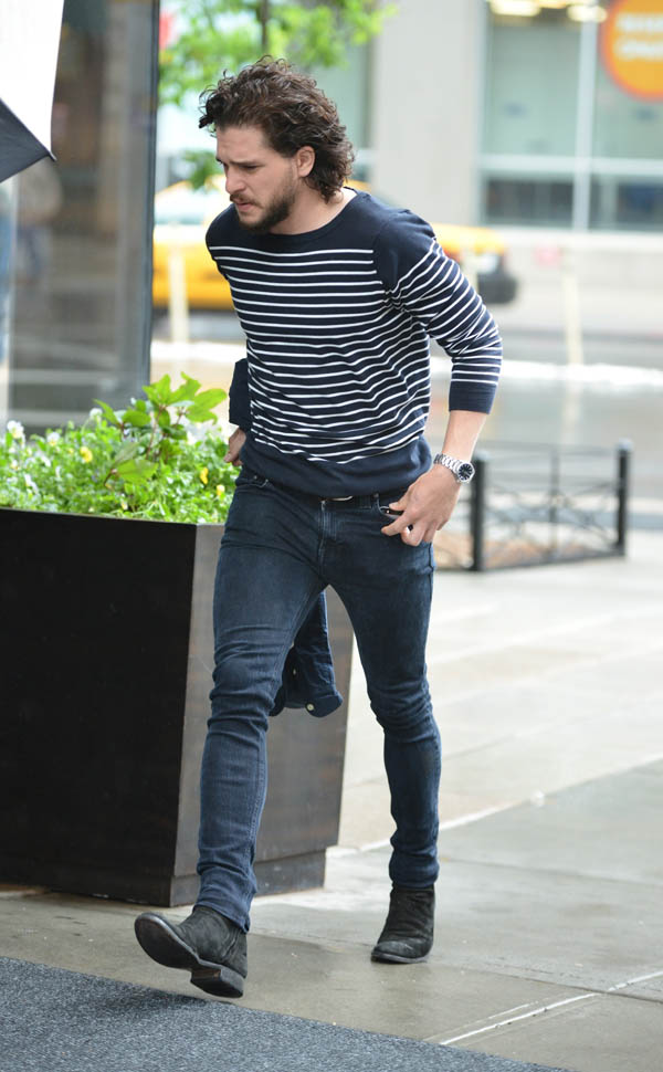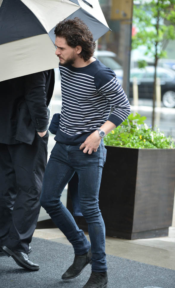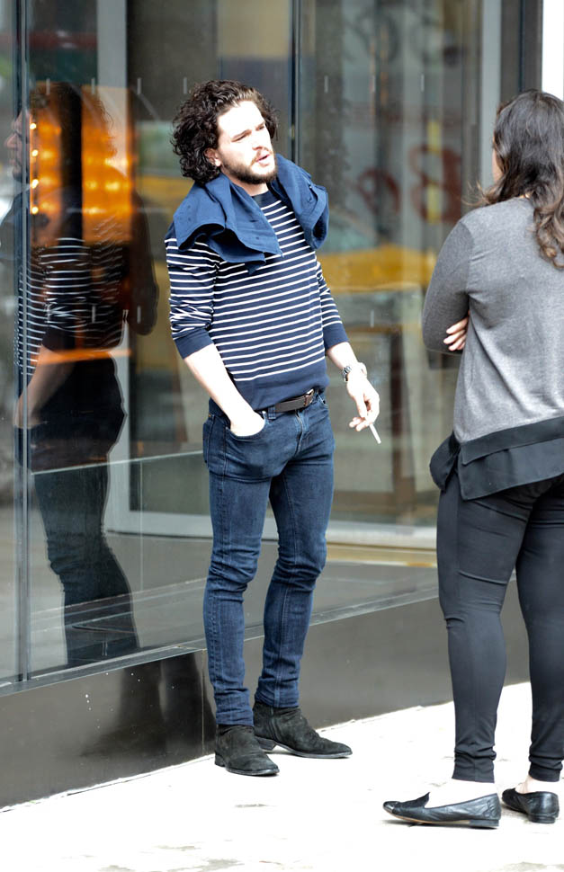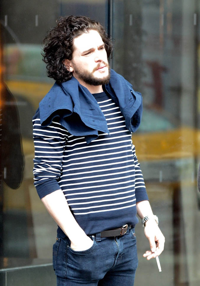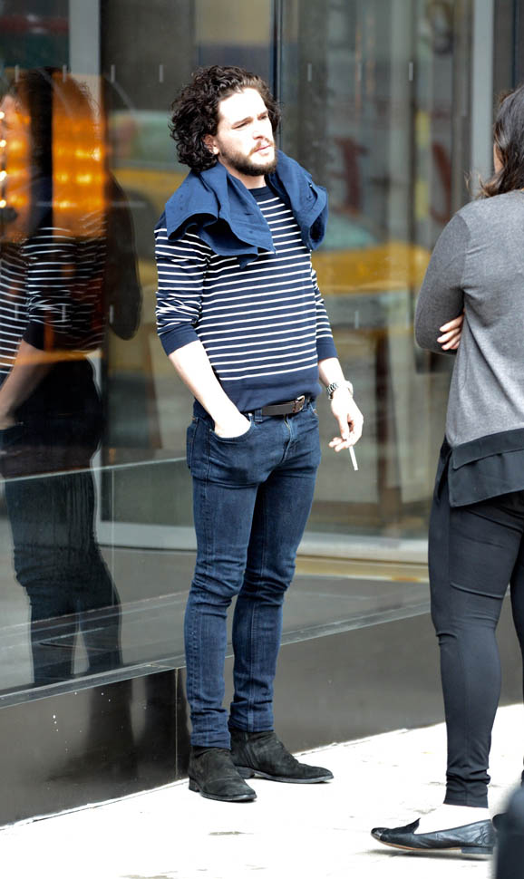 Check out Kit Harington in New York, having a smoke outside his hotel today, one day after what happened last night – what many are calling one of the best episodes of Game Of Thrones of all time. At least top 3. That battle was so well-directed, but in particular, to me at least, the last minute or so, when Jon and the zombie boss are staring each other down. Or, rather, the zombie boss is staring down Jon who can barely breathe and is straight up terrified. It reminds me of that interview Kit gave at the start of the season when he said it was the first time he’s had more pages than Peter Dinklage. He also said that that entire fight – it took a month to shoot – was the hardest thing he’s ever done. Yeah.