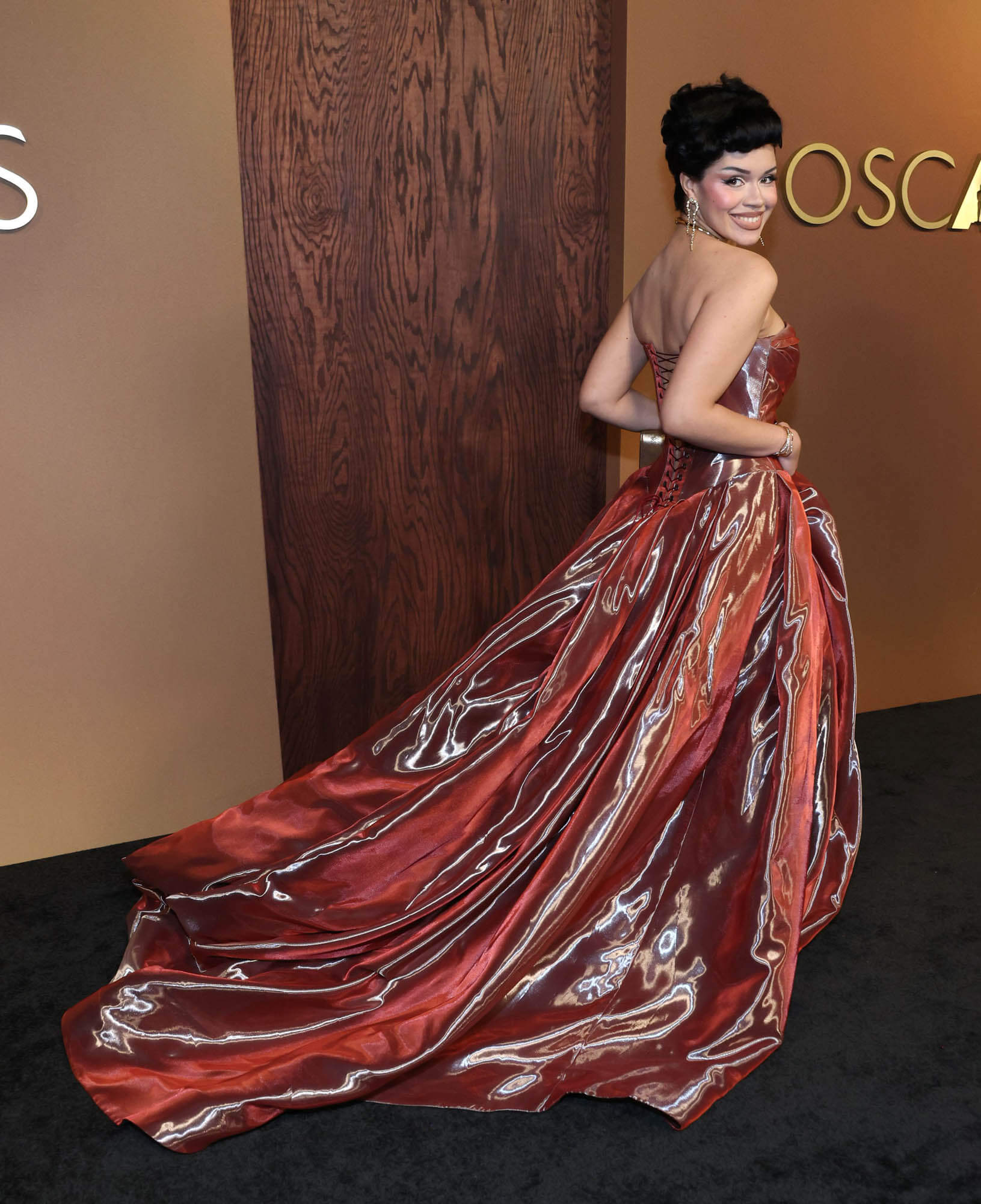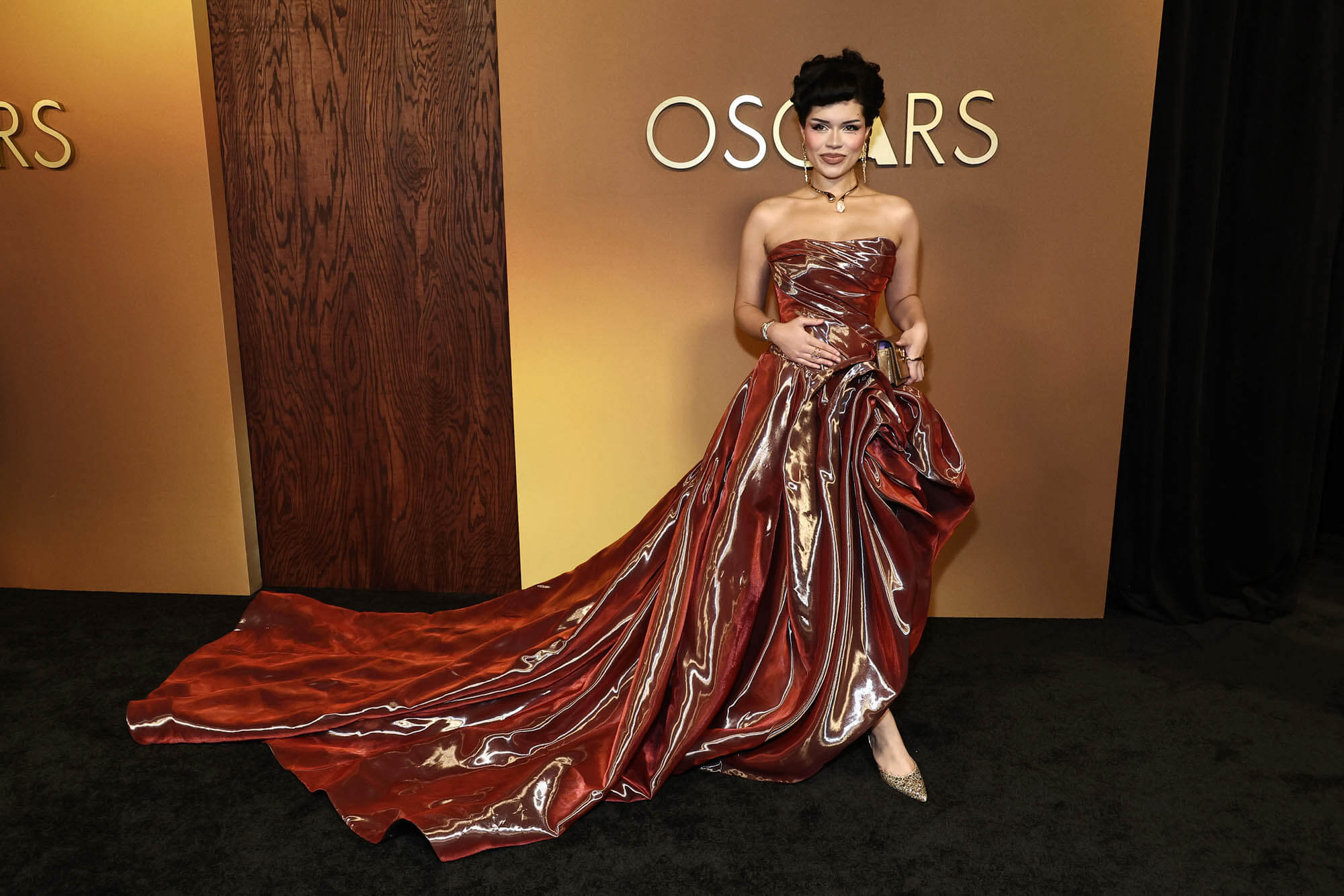 Here's Grammy-nominated and hopefully soon-to-be Oscar-nominated EJAE in a strapless drop-waist Marmar Halim dress upon arrival.