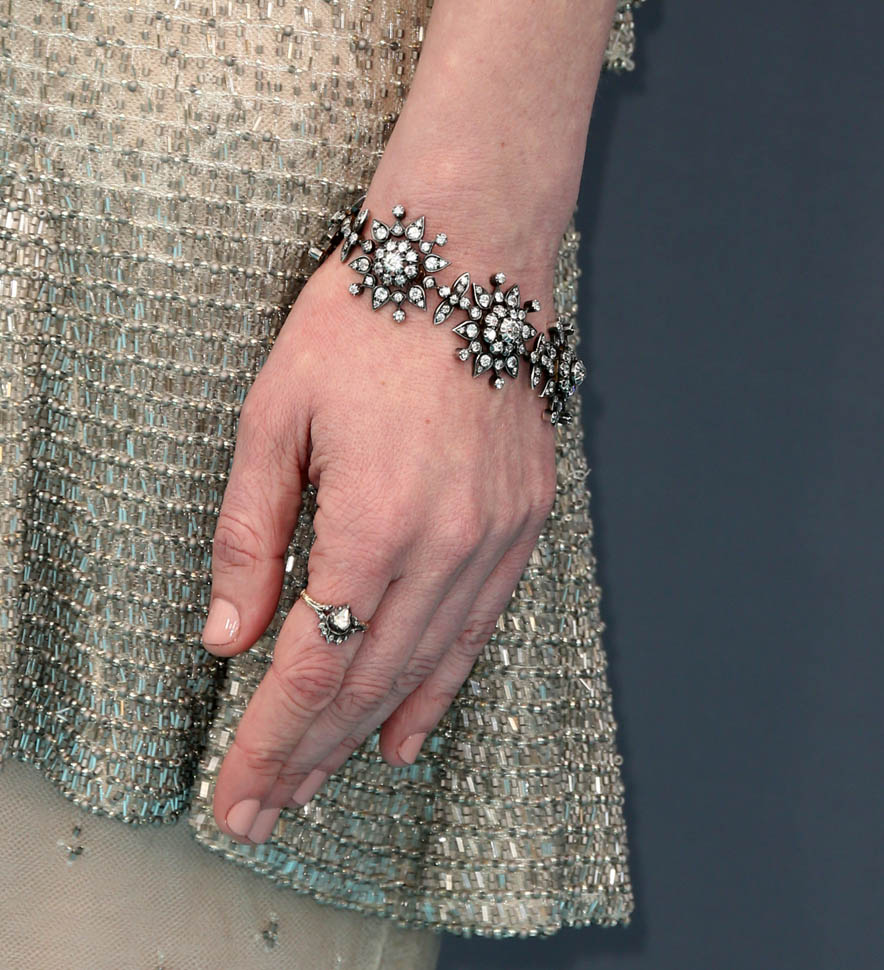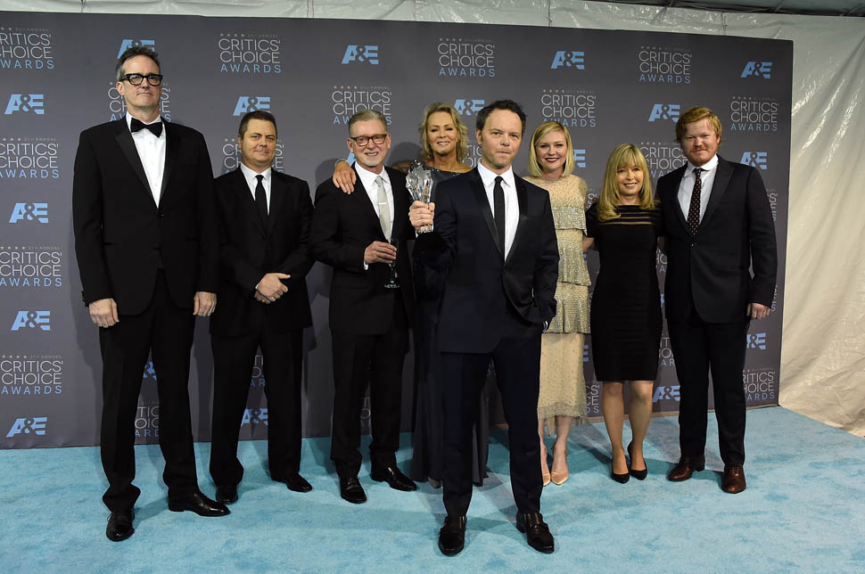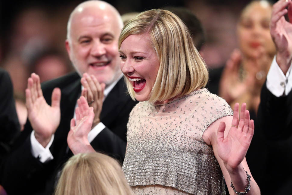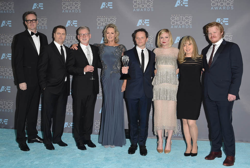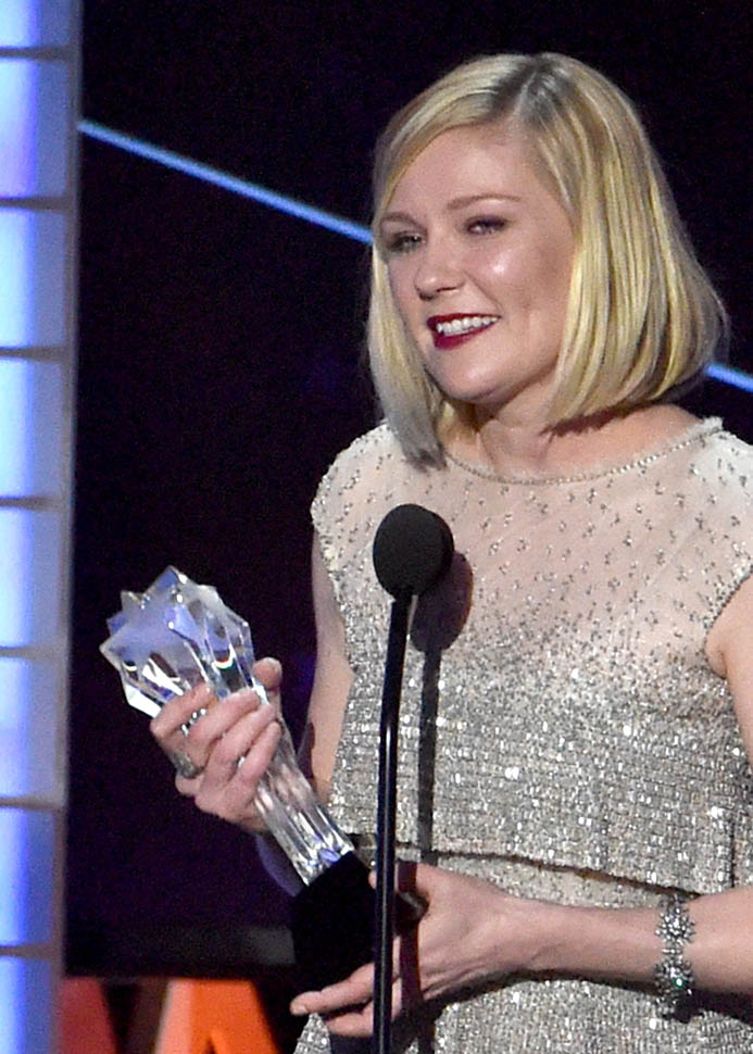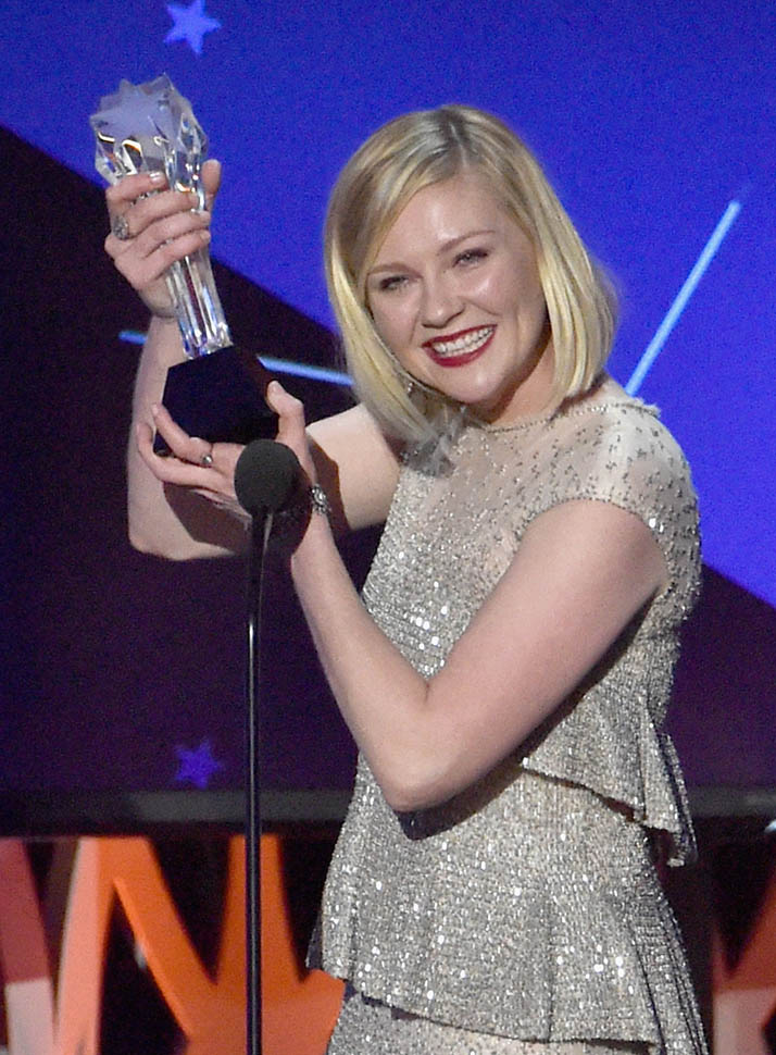 Fargo got shut out at the Golden Globes, but it got some love from the wholly irrelevant Critics’ Choice Awards, where it won four awards, including Best TV Movie/Limited Series, and Best Actress in a TV Movie/Limited Series, for Kirsten Dunst. I’m not even a Kirsten Dunst fan, and I thought she was pretty goddamned brilliant on Fargo. (Jesse Plemons and Jean Smart also won awards, and this is the only group to nominate Bokeem Woodbine, who was OUTSTANDING.) Dunst showed up to collect her award, and wore a cool Lagerfeld dress that I really like. Not a huge fan of the shoes, but the dress is baller. She also gave a mercifully short acceptance speech. She seemed excited to win, but at the same time, I don’t think Kiki has any delusions about the importance of this award. It’s a really fancy doorstop.