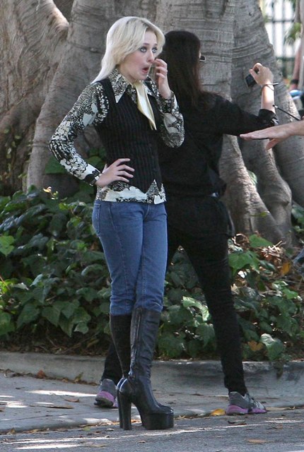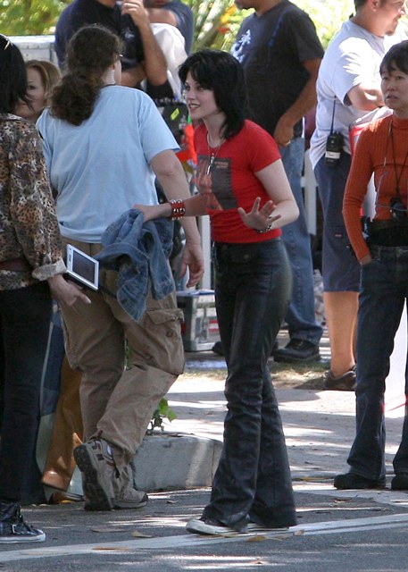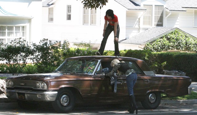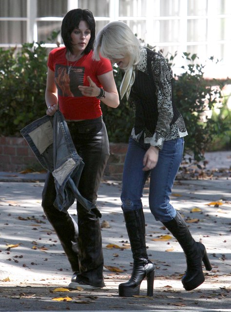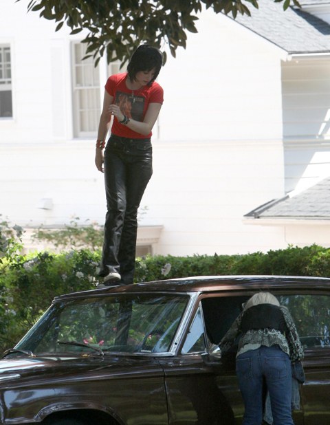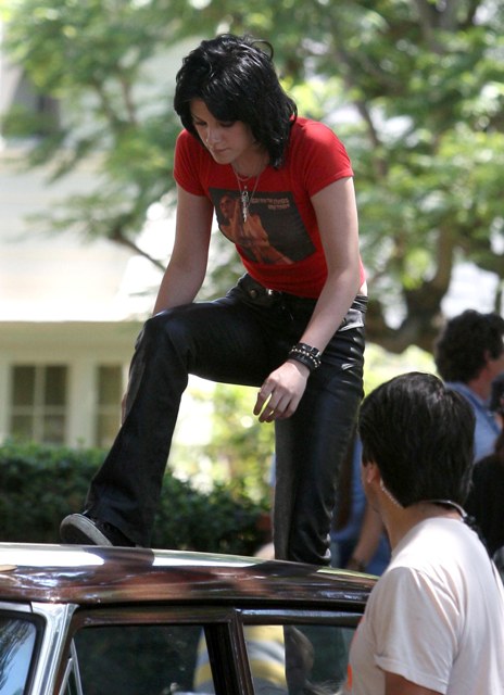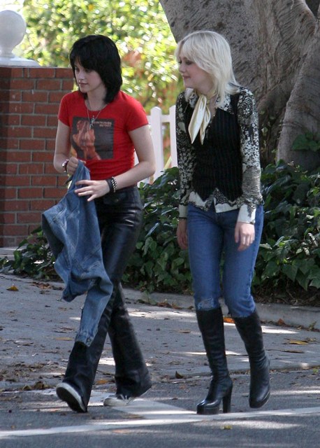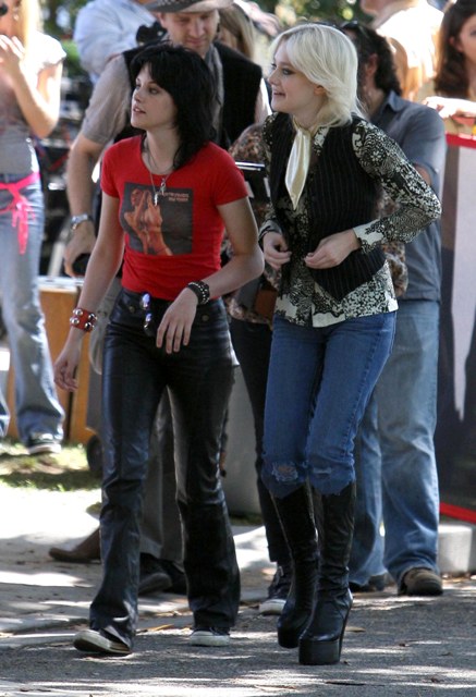 Kristen Stewart and Dakota Fanning yesterday on the set of The Runaways working that old school style. High waist leather pants. Please. If I put those on I’d be the Chinese Porny Simpson.