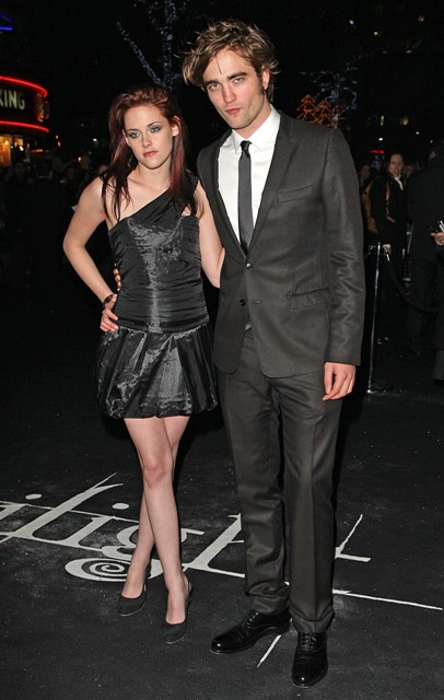 Robert Pattinson and Kristen Stewart tonight in London for the Twilight UK premiere. The mayhem wasn’t exactly as dialed up as it was in America. Twilight fever is still catching on.