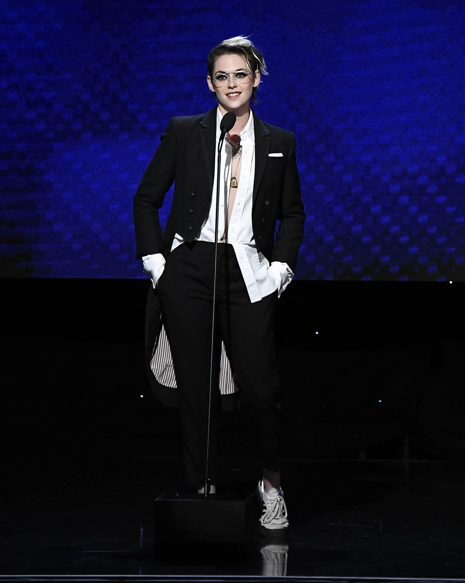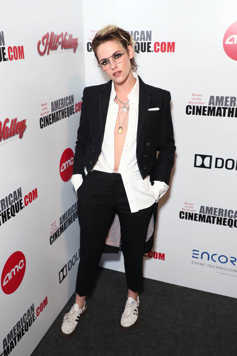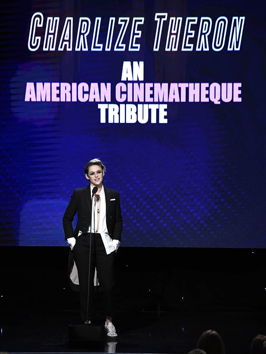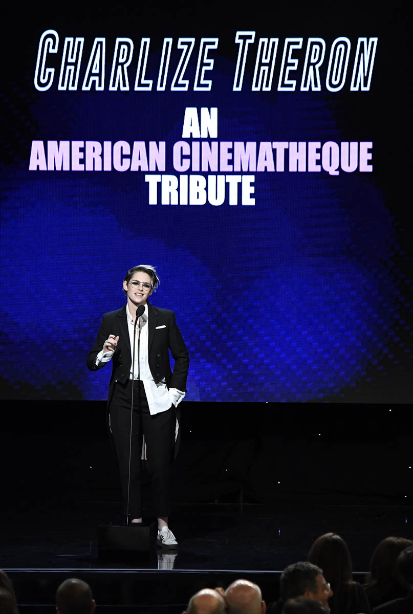 I’m not gay but I have a feeling I’ll be thirsting after Kristen Stewart too. I was thirsting after seeing shots of her at the American Cinematheque gala the other night honouring Charlize Theron in a morning suit with the shirt unbuttoned past the navel and sneakers and glasses, and all I can say to this tweet is… same: