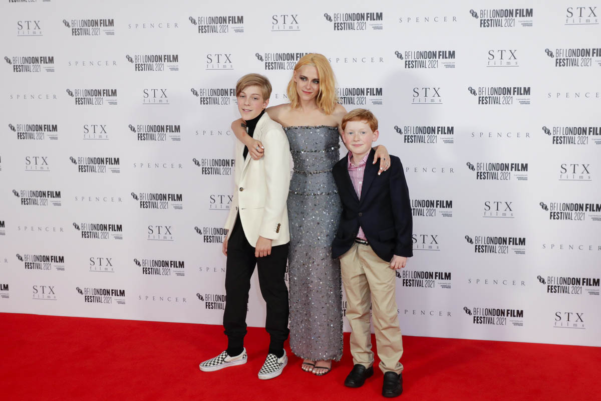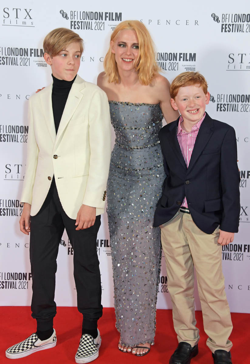 Kristen Stewart continues her winning streak, supporting Spencer at the BFI London Film Festival yesterday. With her on the red carpet were Sean Harris (lately of The Green Knight), Jack Farthing, who plays Prince Charles, and young actors Jack Nielen and Freddie Spry, who play William and Harry, respectively. The kids don’t really look like William and Harry any more than KStew really looks like Diana, but they do look like they could be the offspring of Stewart’s take on Diana, if that makes sense. Especially Jack Nielen, he looks convincingly like a product of the Charles and Diana in the Spencer trailer. I’m always charmed by this sort of kid-casting. Kudos to the Spencer casting director, Amy Hubbard, for finding those kids. This is the first acting credit for both.