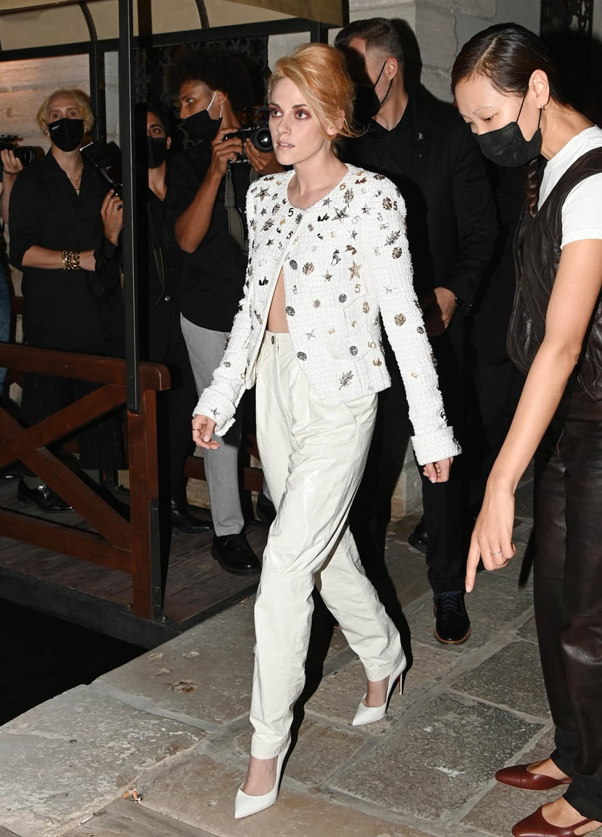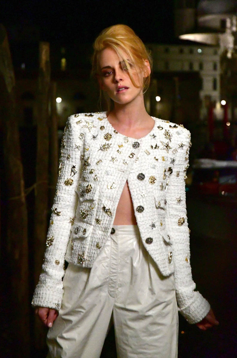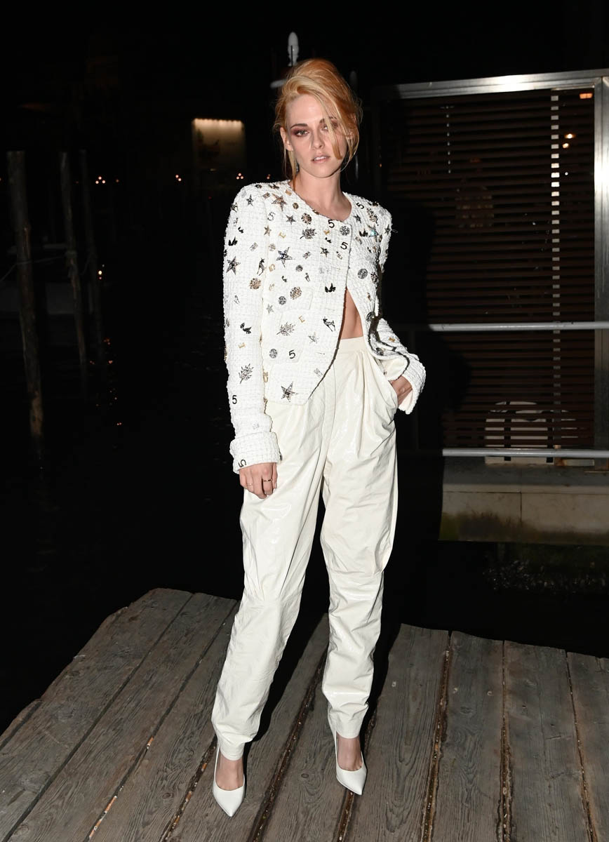 It may be that she’s grown her hair like this for a role. It may be that it also works on the campaign trail – a softer vibe that doesn’t compromise her fashion identity. Because the pants on the carpet is still very Kristen Stewart. And the Chanel playsuit that she wore to the photo call, with the short shorts, is also very Kristen Stewart – a classic, timeless look from the most famous luxury brand, but tailored for her sensibilities, and still very much in the lane of occasion and in the spirit of the person she’s playing.