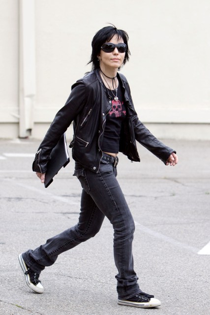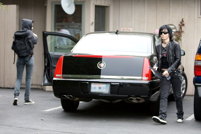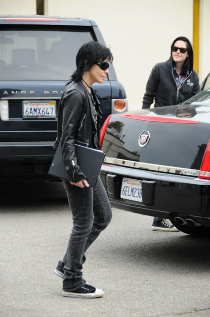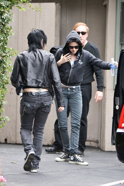While Robert Pattinson narrowly avoided getting strangled by Twi-hards yesterday in New York, and probably spent the rest of the night wanting to strangle himself (the Twilight albatross gets heavier and heavier…at this point it’s more like a noose), Kristen Stewart was in LA working on her Joan Jett biopic and hanging out with Joan Jett herself.