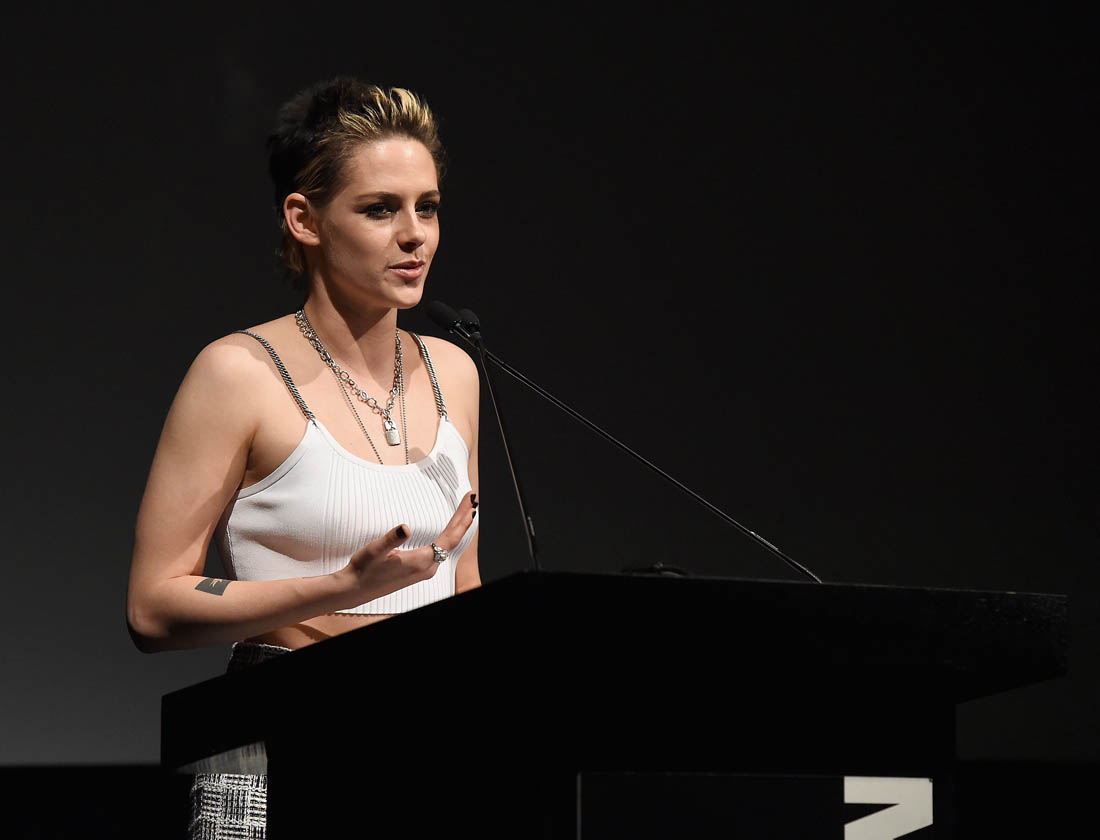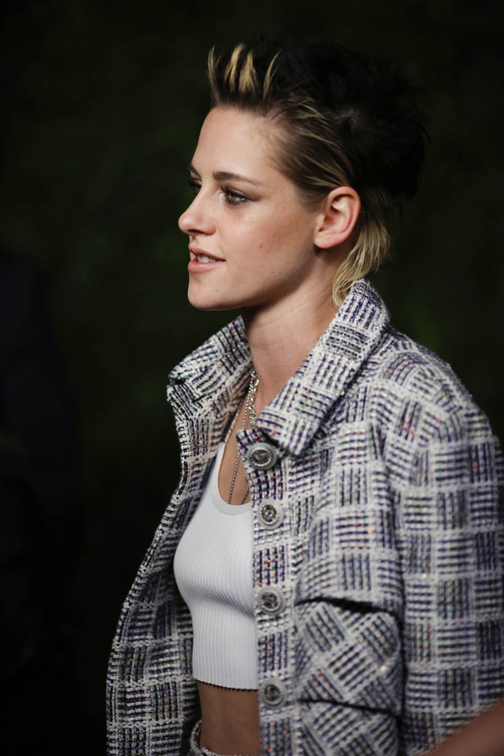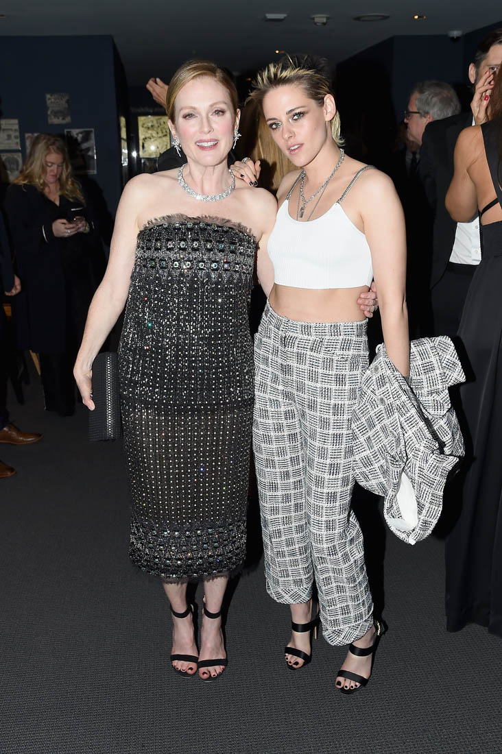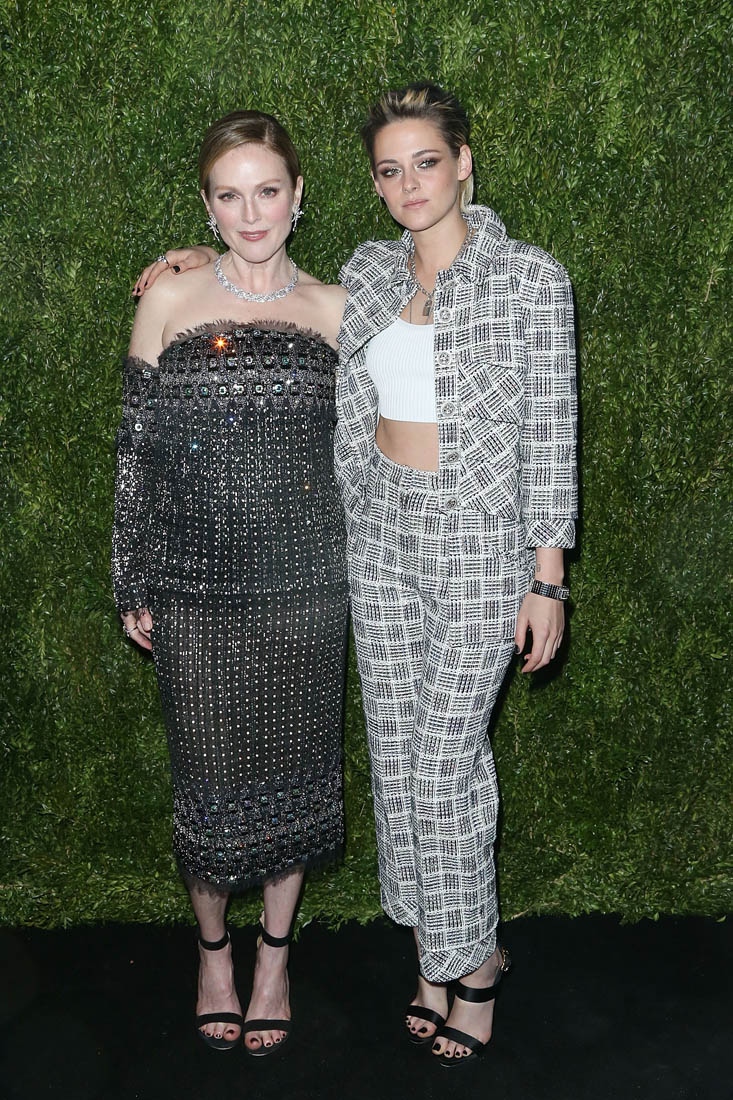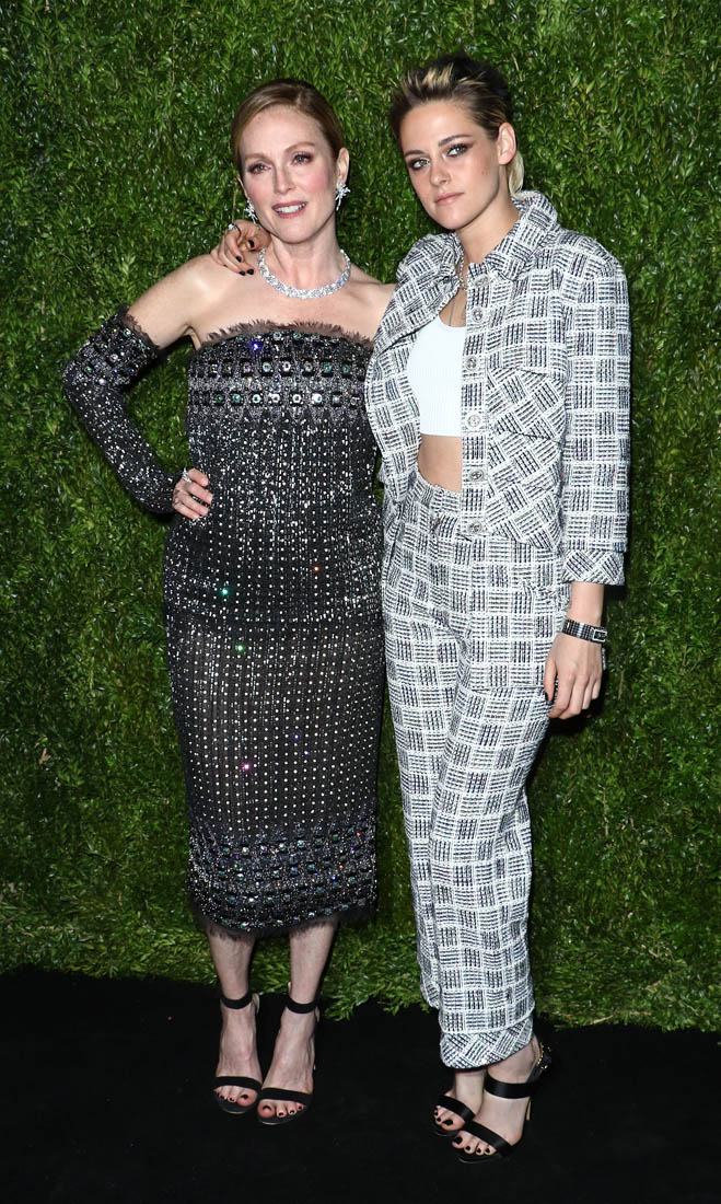 Kristen Stewart was in New York last night at an event at MOMA to honour Julianne Moore. They both wore Chanel. Kristen wore a cropped tank under her suit jacket. She also wore a white cropped top last week at a screening. And she’s been seen several times lately in cropped tops or tanks when she’s out casually. Here’s an example from this weekend. I like a high waisted cropped look. But my lower back and stomach always get cold. That entire region, front to back, is always cold. Does anyone else have this problem? Is there something wrong with me?