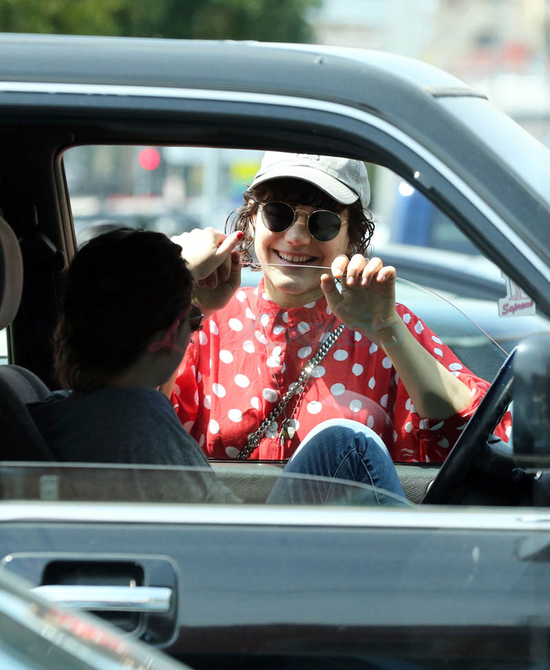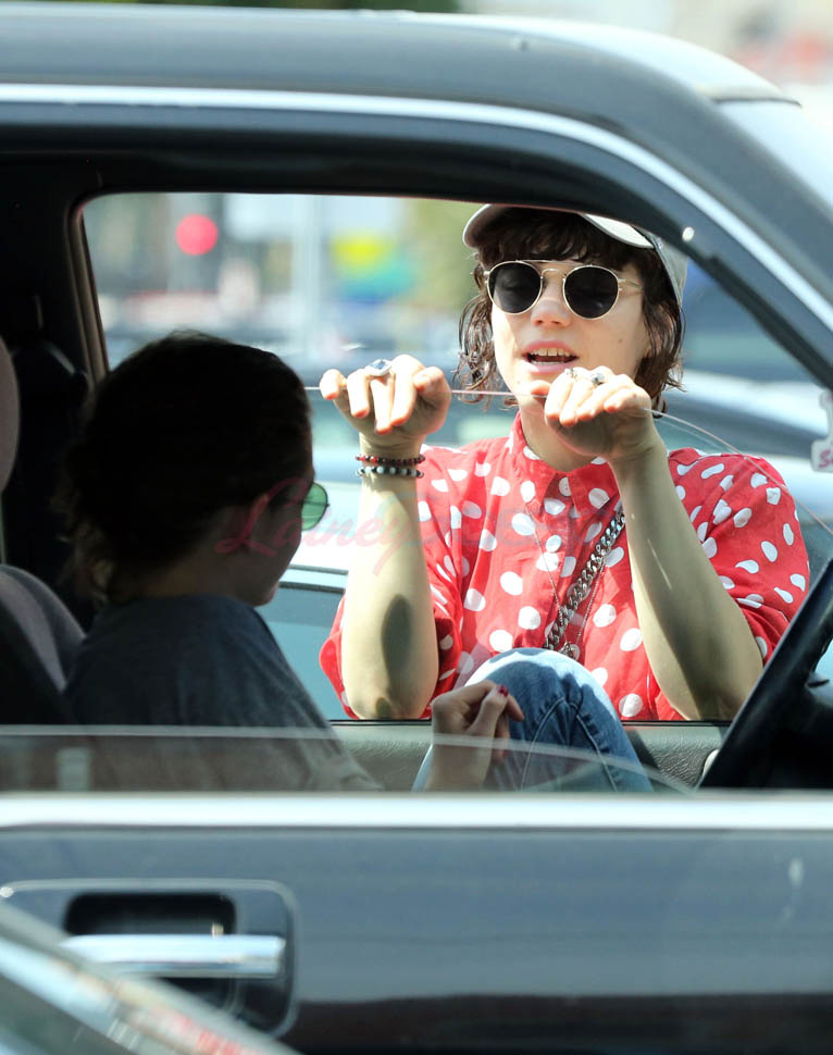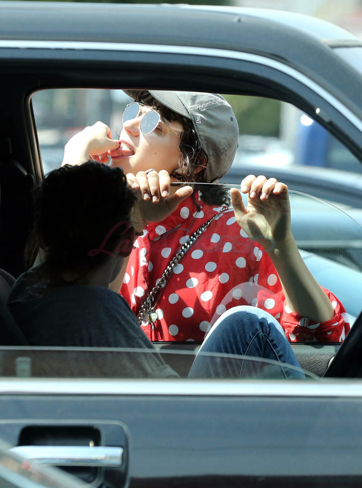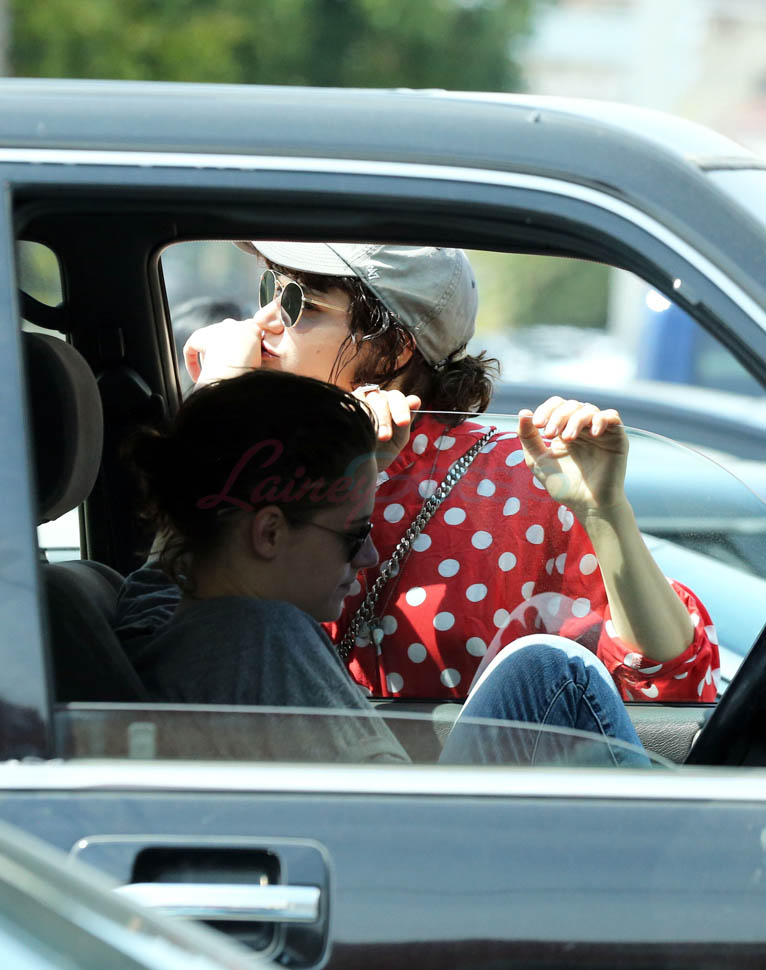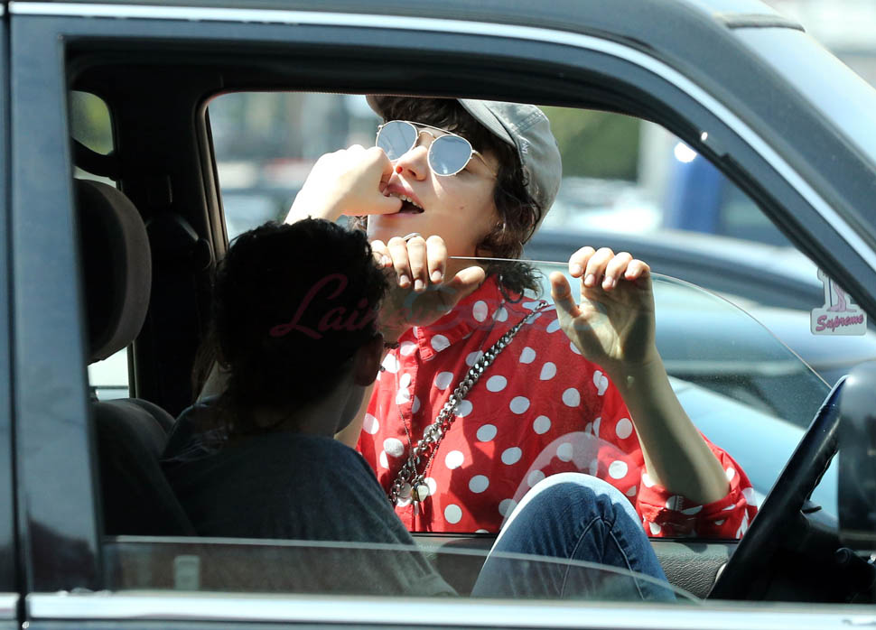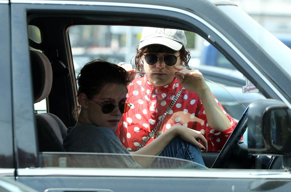 Check it out. At one point, Kristen’s inside the car talking to Soko by the window. Then, I don’t know, maybe she’s feeding her something? Because Soko’s now sucking on Kristen’s thumb. Which, I mean, we all remember what it’s like at the beginning of a relationship. Anything and everything becomes erotic. Anything and everything becomes an excuse to make out.