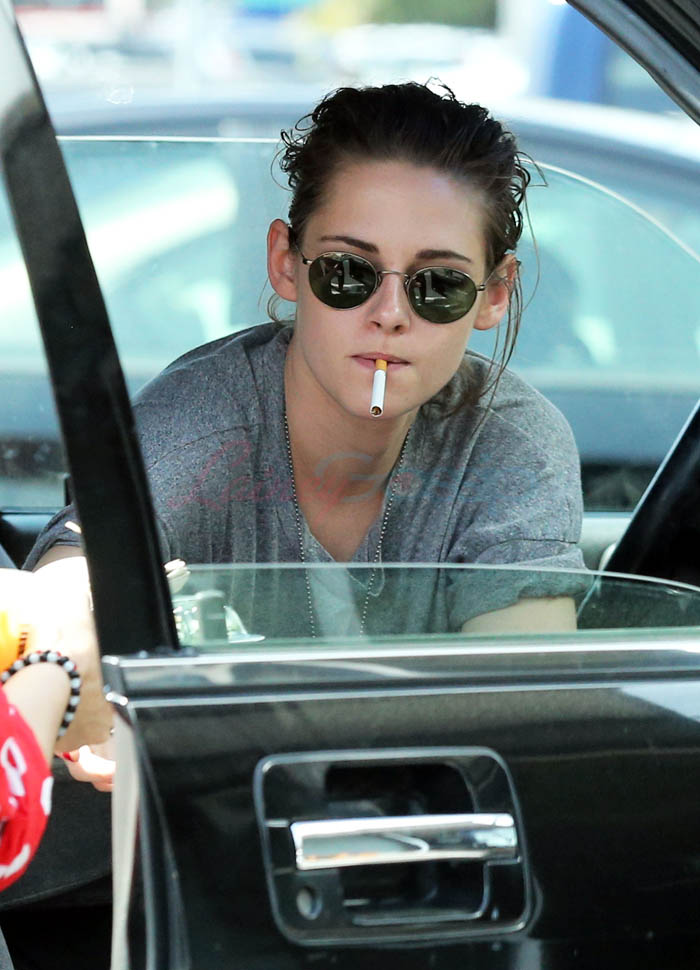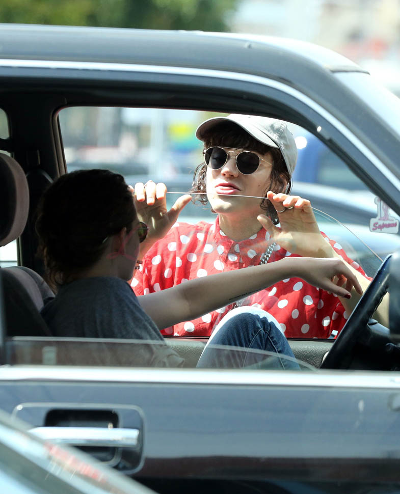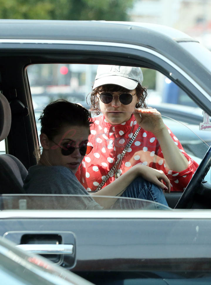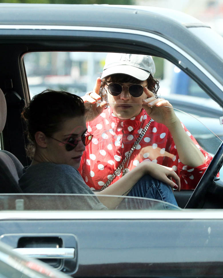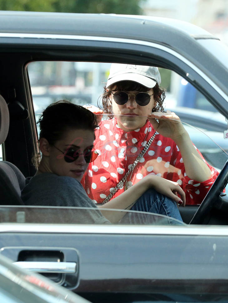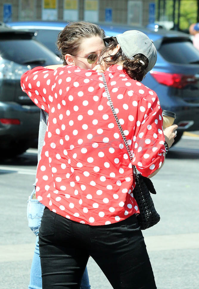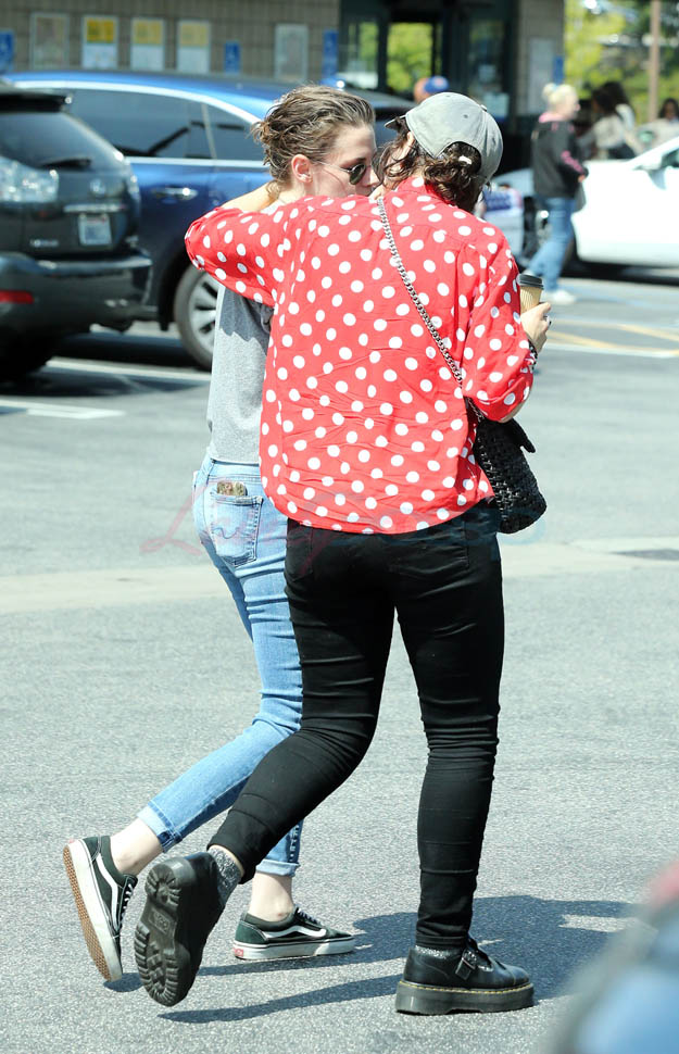 Kristen Stewart and her girlfriend Soko were in LA for Easter Weekend. They’ve been papped consistently the last couple of weeks and definitely not running for cover in the presence of photographers. In fact, this is the most open Kristen’s been in a relationship. When she was with Robert Pattinson it was practically dumpster-diving every time. With Alicia Cargile, there was less of an escape impulse but it certainly wasn’t what we’re seeing with Soko – holding hands, in the street kissing, and now… thumbsucking?