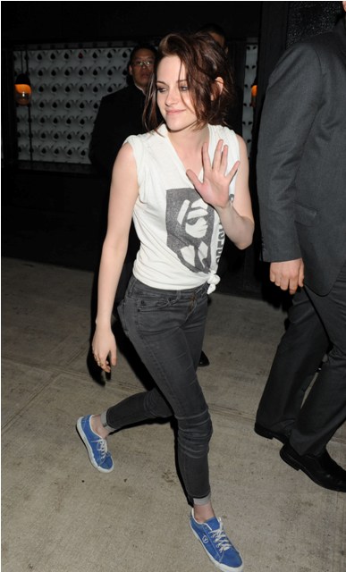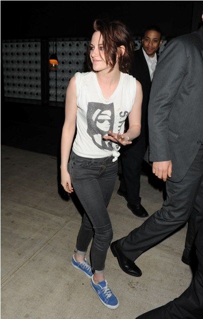 Anyway, am also attaching a couple of pictures of Stewart back in a t-shirt and jeans at the afterparty. See now this is sensible to me. First of all because it gets messy at an afterparty and those gowns are several thousand dollars. But also...