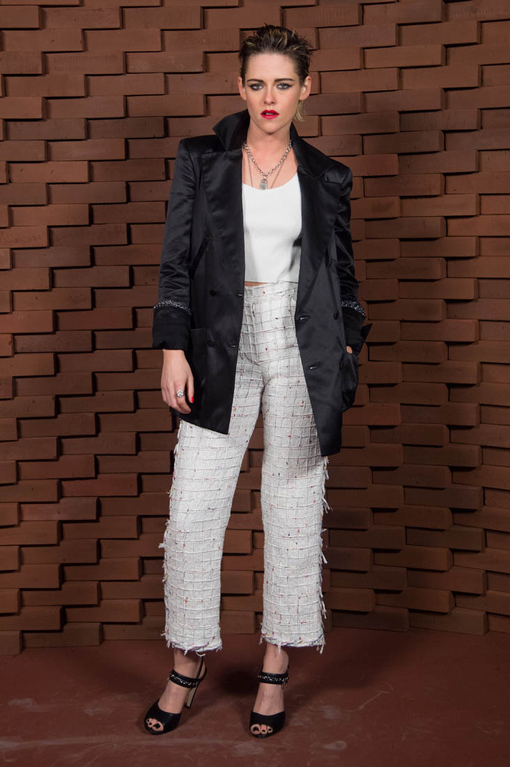 Now, let’s talk about Kristen’s outfit. I like it a lot. High-waisted pants, a crop top, topped with a longer jacket or blazer are my whole sh-t right now. She looks great but looking at Kristen in these photos also gives me anxiety. She’s giving fierce model I Don’t Give A F-ck face in every shot. Being that cool must be exhausting.