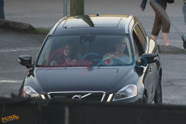 New photos of Kristen Stewart and Robert Pattinson on set yesterday. Joan Jett hair made an appearance early in the morning upon arrival – so much better than that ghetto wig – as both look relaxed, hitting up on coffee to prepare for a long day working on Eclipse.