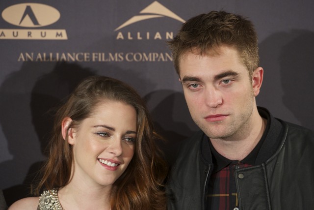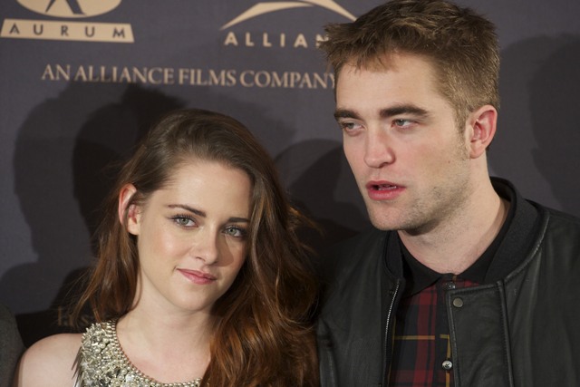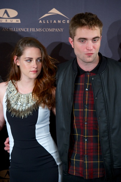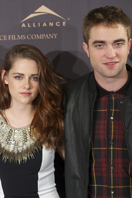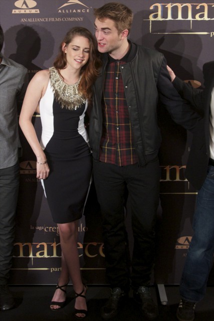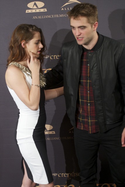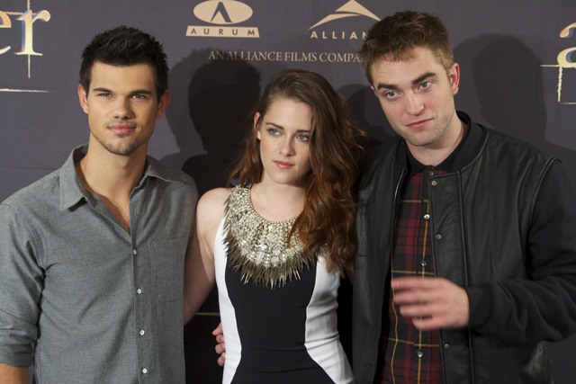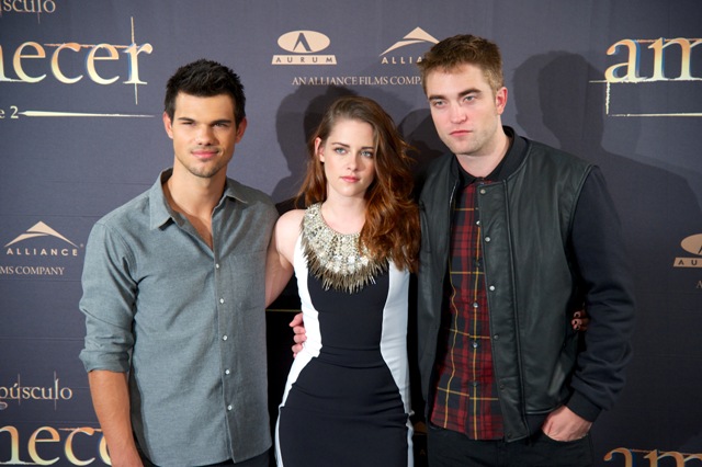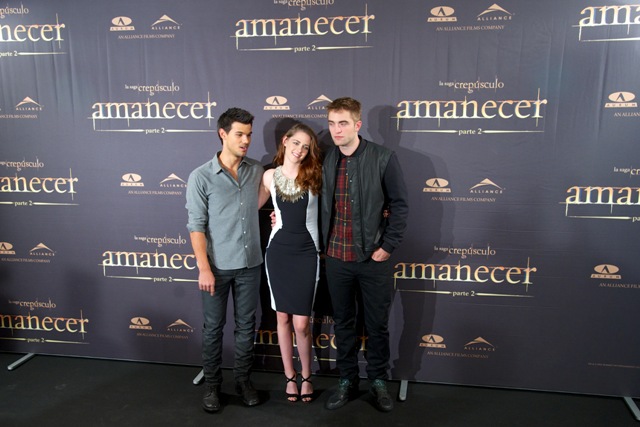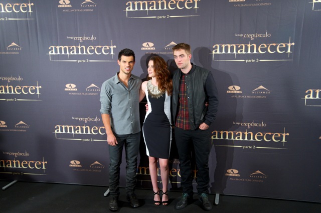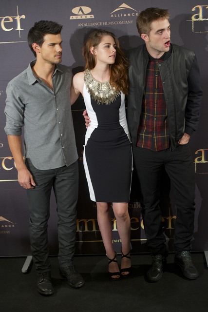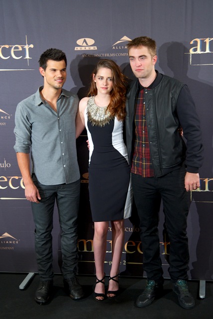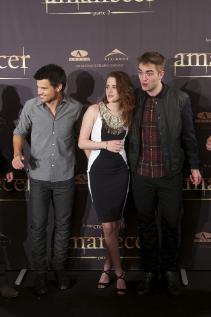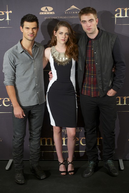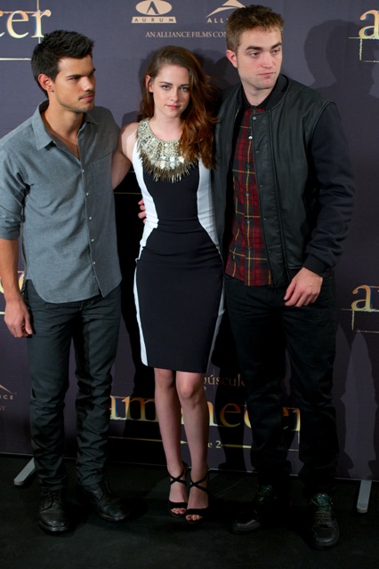 Here are Pattinson, Kristen Stewart, and Lautner in Spain today promoting the movie. Great accessorising with an otherwise boring dress, by her standards. Pattinson has terrible hair right now. And why has Lautner become an afterthought this go-round?