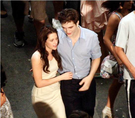 Twi-Hards have been tit bumping each other the last couple of days as photos of Kristen Stewart and Robert Pattinson have been released of the two together in Brasil filming Breaking Dawn. Production has moved to Rio to shoot the exterior honeymoon scenes. Already there are some promising improvements. Stewart’s extensions/wig for instance looks good from this distance. And Pattinson’s pants are even working for me too.