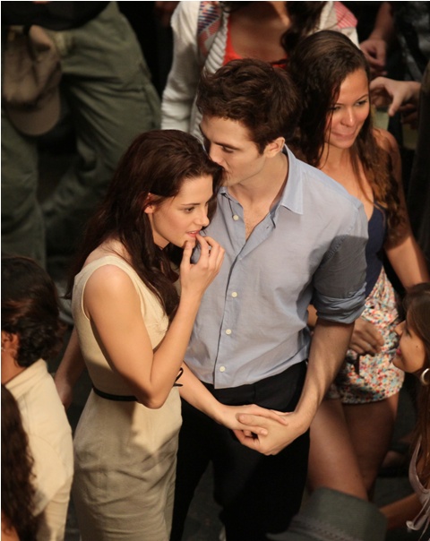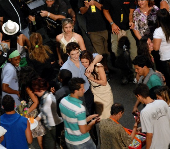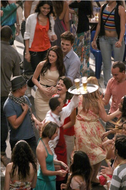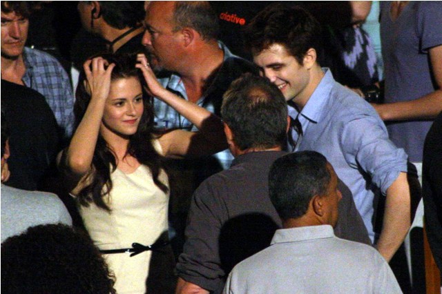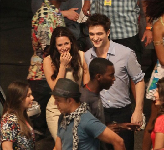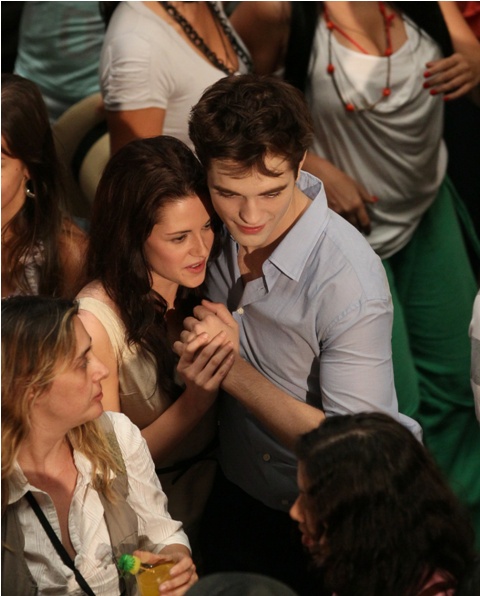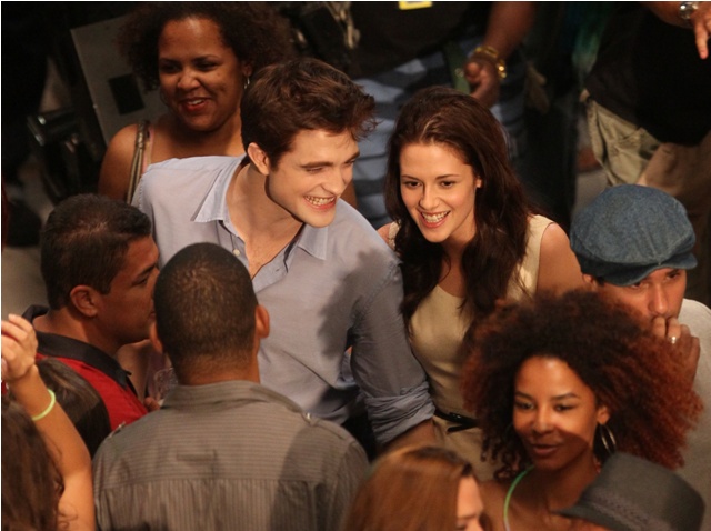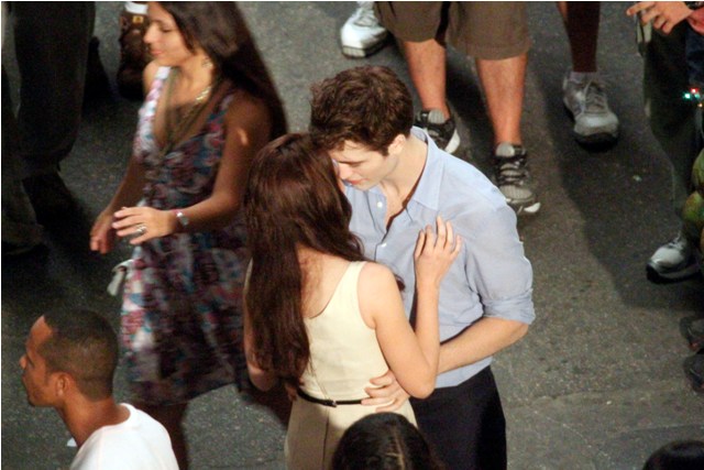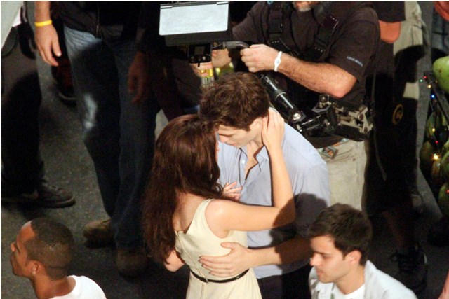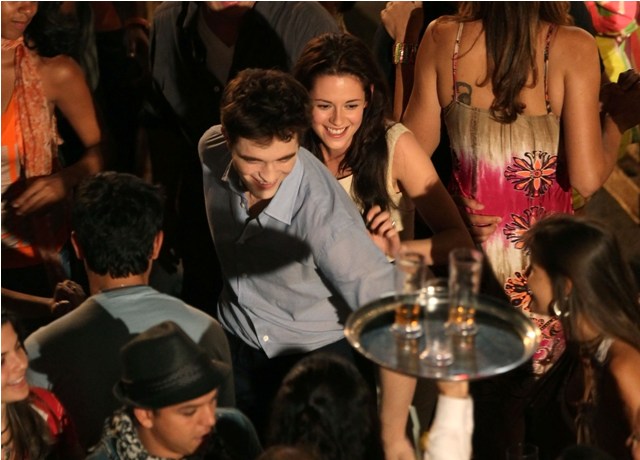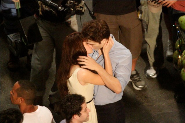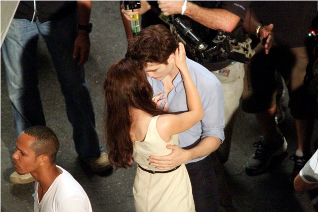 Twi-Hards have been tit bumping each other the last couple of days as photos of Kristen Stewart and Robert Pattinson have been released of the two together in Brasil filming Breaking Dawn. Production has moved to Rio to shoot the exterior honeymoon scenes. Already there are some promising improvements. Stewart’s extensions/wig for instance looks good from this distance. And Pattinson’s pants are even working for me too.