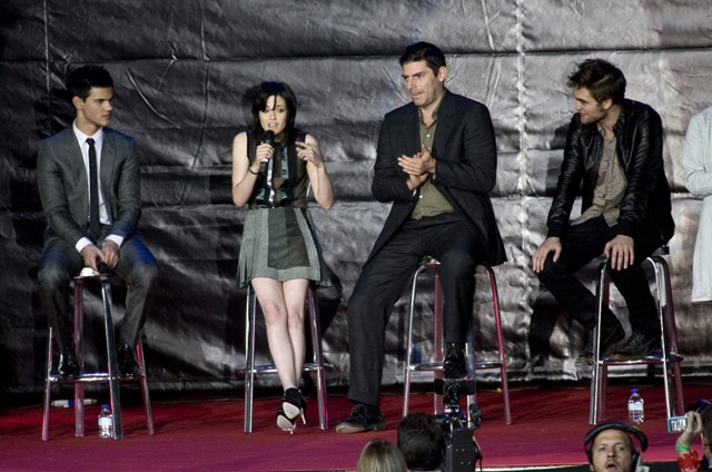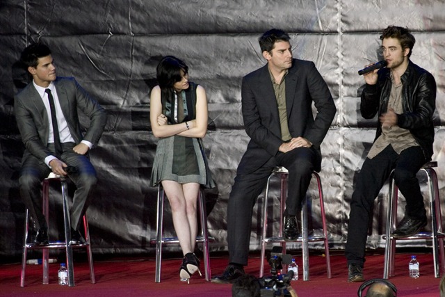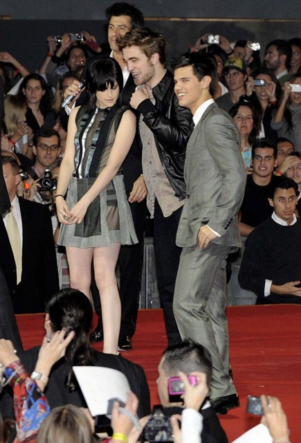 Perhaps before then she can give her co-stars a hand. Taylor Lautner’s side lean is becoming a problem. And Robert Pattinson’s mothering hips have made their return. I am in the office today working with Laura. She warned me that if I brought up the mothering hips that we would have words. I guess we’ll be having words.