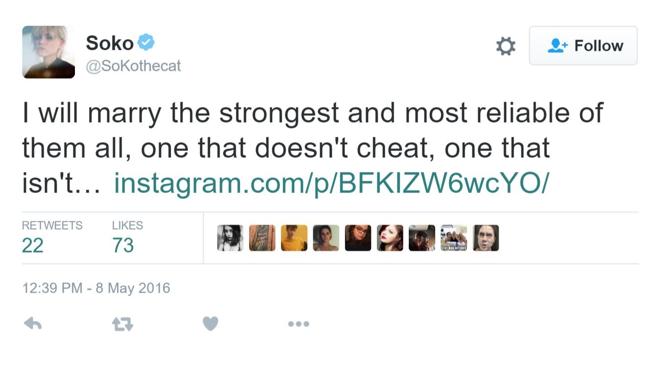 I will marry the strongest and most reliable of them all, one that doesn't cheat, one that isn't… https://t.co/jKvBDbszfJ— Soko (@SoKothecat) May 8, 2016
