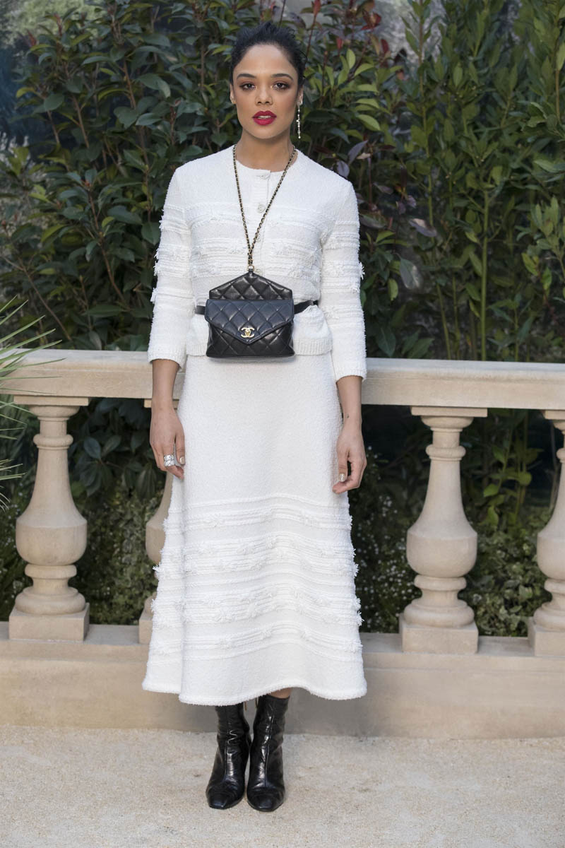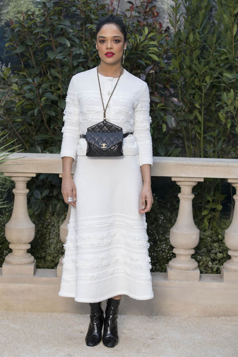 Also at Chanel – Tessa Thompson in white, with the handbag around her neck. Are you in? It’s definitely a look and I love it, on the runway. It becomes less of a bag than an accessory, a supersized necklace. That said, maybe only she could pull it off. After all, she’s Tessa Thompson. At her first ever Chanel couture show. Which was not a small deal for her, as she told W yesterday when they were invited to join her as she prepped for the event to talk about her personal style, how she builds her looks, where she shops, and what clothes mean to her. Oh? You mean clothes mean something?