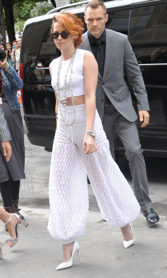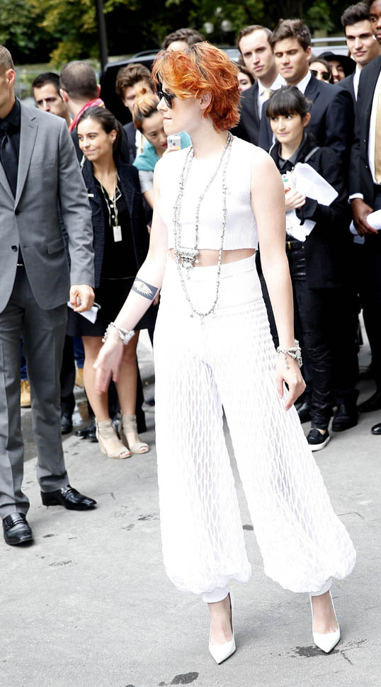 Desperately Seeking Susan. That was what came to mind when I saw these photos of Kristen Stewart’s new look as she arrived at the Chanel haute couture presentation today in Paris. It’s a movie Twi-Hards, chill. An 80s movies starring Madonna and Rosanna Arquette. I wish Stewart had taken this cut all the way blonde with dark roots.