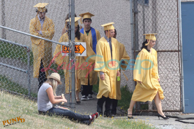 About the scenes – the day before (Thursday), “Bella” and her high school friends were in the cafeteria, excited about graduation. During filming for graduation the following afternoon, “Jessica” gives a speech.