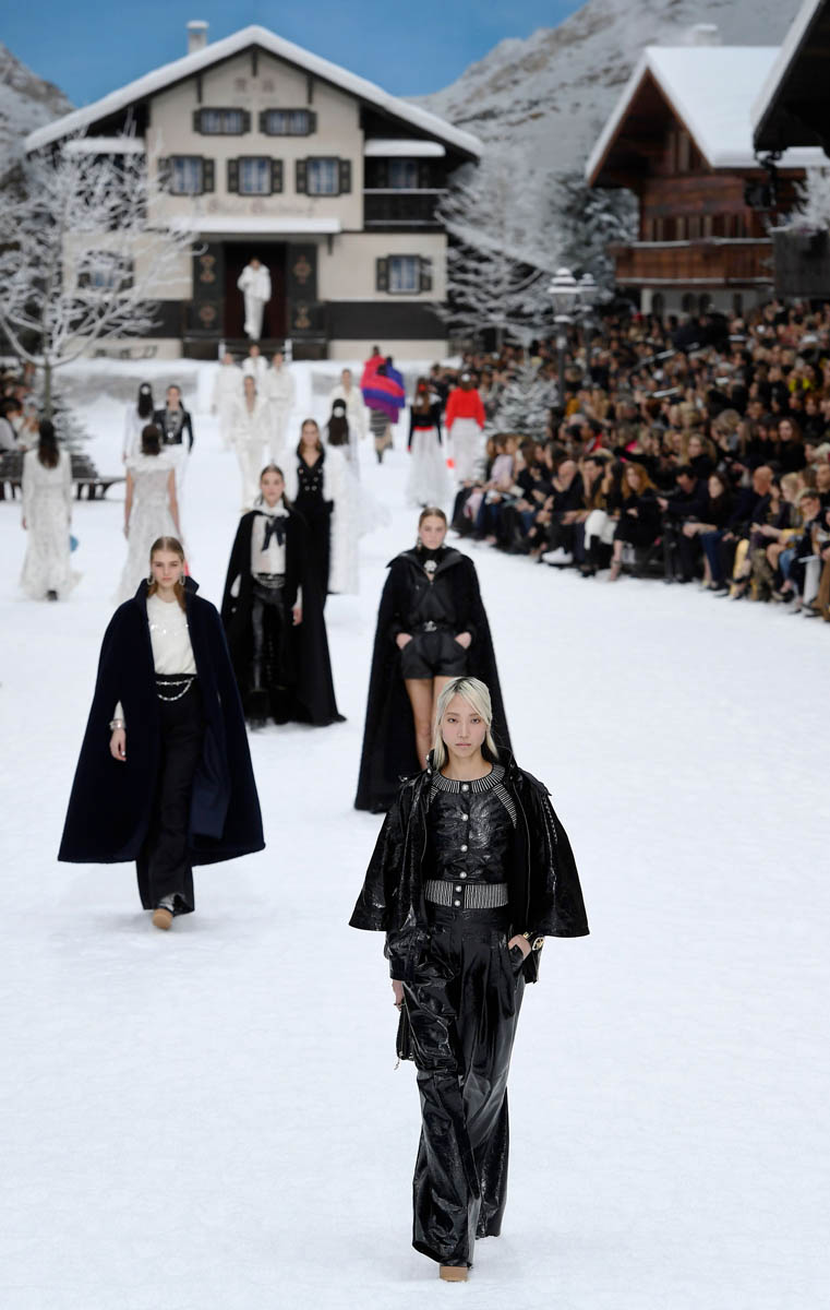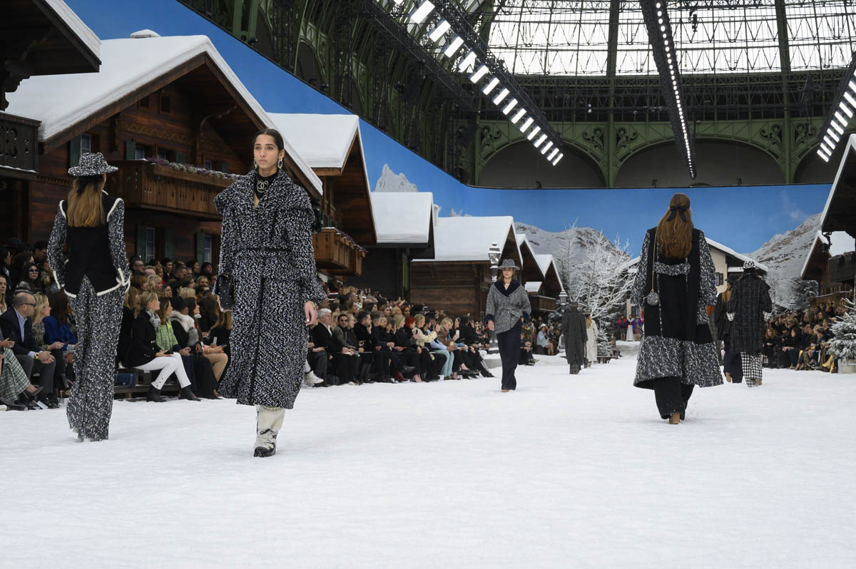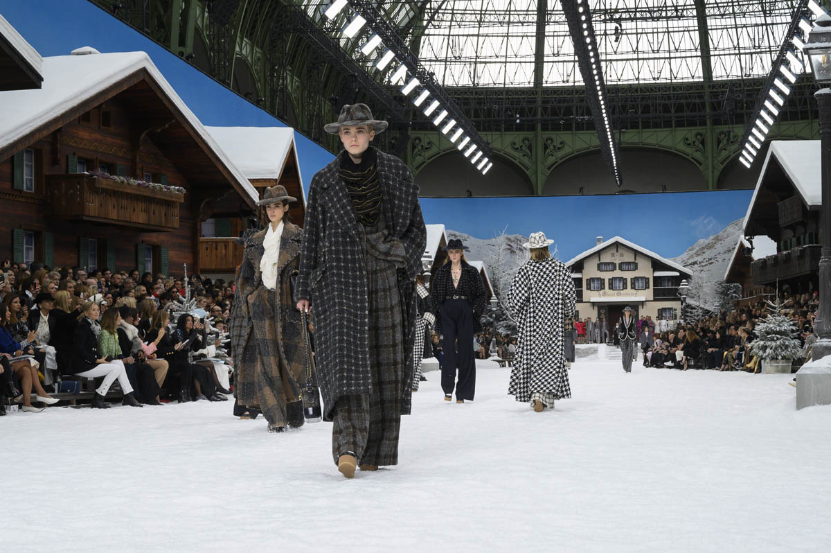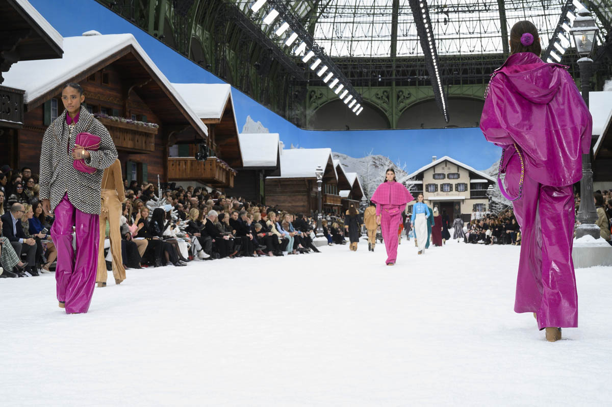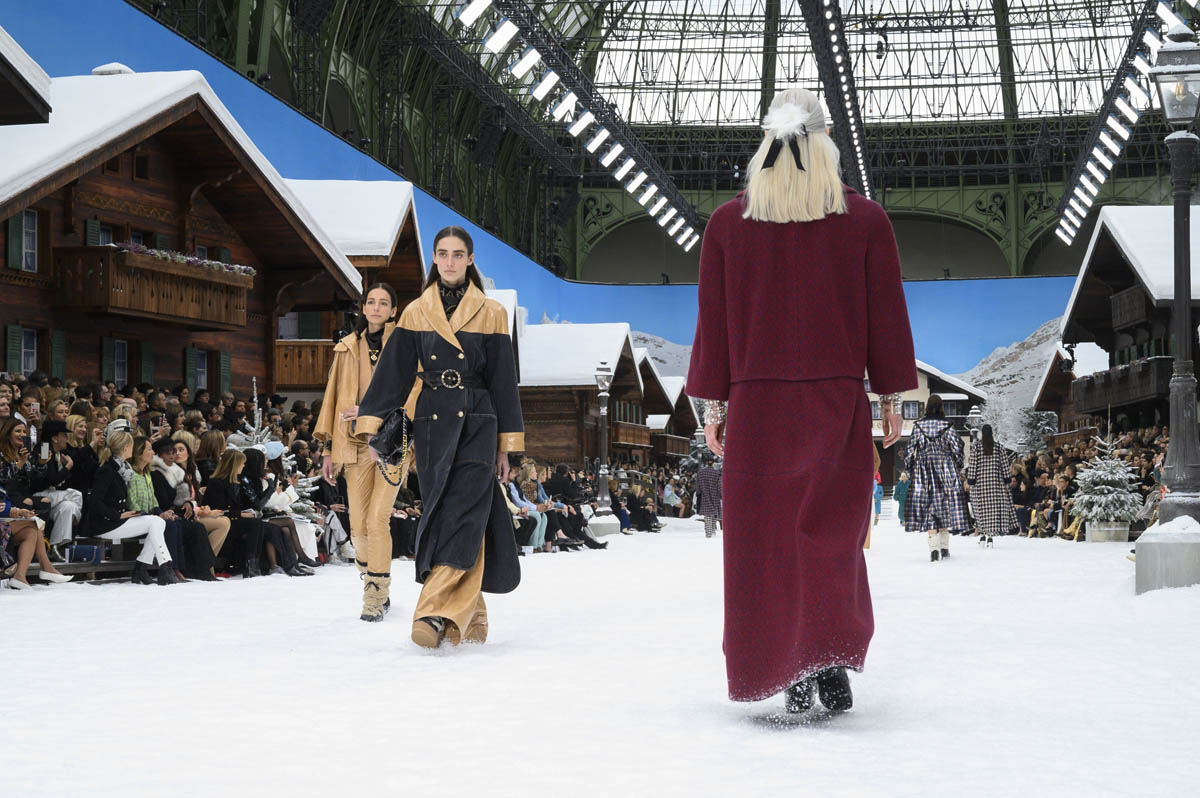 As always where a Chanel show is concerned, the Grand Palais reflects the collection. They’ve built a rocket in there. They’ve turned it into a lush garden, a beach, a grocery store – this time, the Grand Palais was transformed into a ski resort. Theme: chalet fashion and apres-ski style. Look at this. It’s f-cking amazing. And the clothes, as usual, are gorgeous. Roomy too with bigger shoulders, slouchier fits, long loose and drapey pants. My favourite? This f-cking catsuit on Kristen Stewart: patterned to look like Chanel signature quilting (like one of their bags), with the logo plastered everywhere but not too obnoxiously (at least not to me), and it’s CUT LIKE A SKI SUIT, complete with the zipper that gets pulled down as soon as they come down the mountain! Khloe Kardashian is going to get her hands on this and ruin it for everyone.