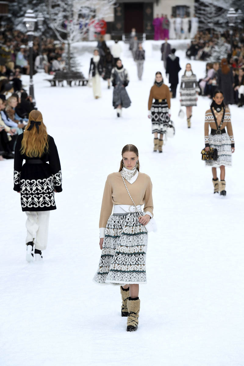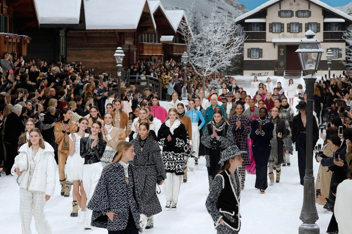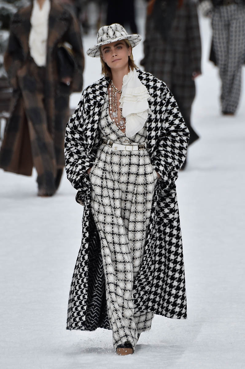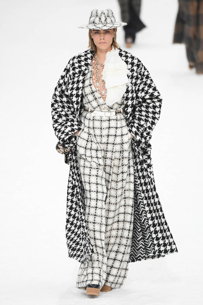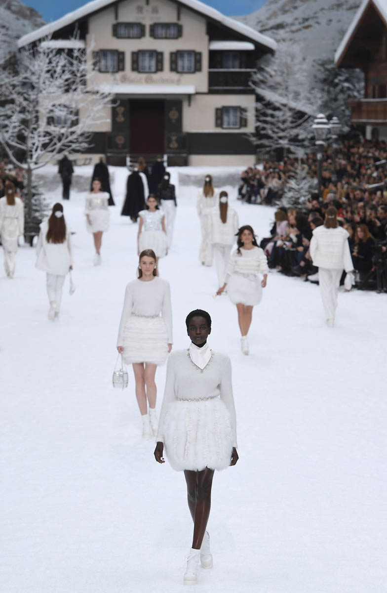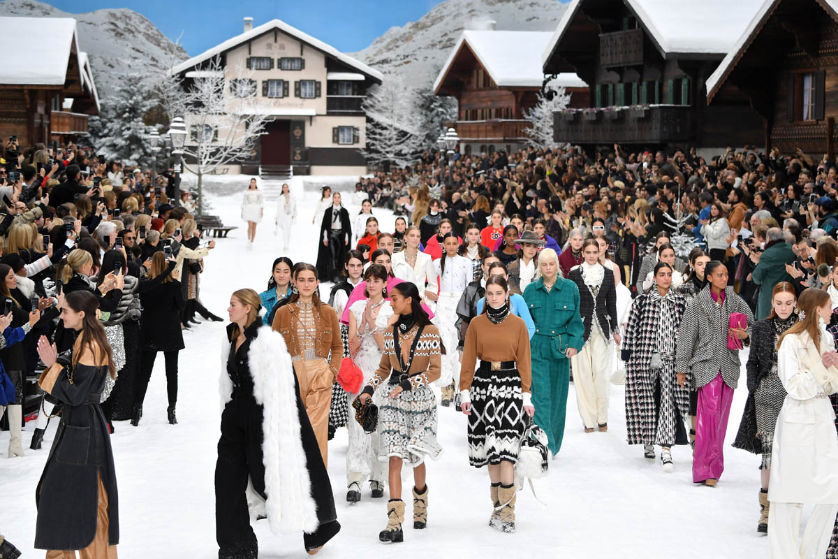 As always where a Chanel show is concerned, the Grand Palais reflects the collection. They’ve built a rocket in there. They’ve turned it into a lush garden, a beach, a grocery store – this time, the Grand Palais was transformed into a ski resort. Theme: chalet fashion and apres-ski style. Look at this. It’s f-cking amazing. And the clothes, as usual, are gorgeous. Roomy too with bigger shoulders, slouchier fits, long loose and drapey pants. My favourite? This f-cking catsuit on Kristen Stewart: patterned to look like Chanel signature quilting (like one of their bags), with the logo plastered everywhere but not too obnoxiously (at least not to me), and it’s CUT LIKE A SKI SUIT, complete with the zipper that gets pulled down as soon as they come down the mountain! Khloe Kardashian is going to get her hands on this and ruin it for everyone.